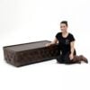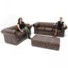 Chesterfield Coffee Table To Hire. Finished in a vintage brown leather, this superb quality buttoned table is great for a Gentleman Club theme, or elegant vintage seating, and looks fabulous with our other matching leather chesterfield suite!