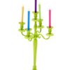 Green Candelabra with Coloured Candles for hire. These ย colourful ย 5-arm ย candelabras come complete with a contrasting mix of equally ย colourful ย battery operated candles. This is a really fun item for your event table ย centres! ย We can also offer the candelabra in pink and blue versions – see the image right and below.