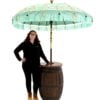 Parasol Poseur Table to hire. This chic, Balinese style parasol makes the perfect addition to our wood effect barrel poseur table.