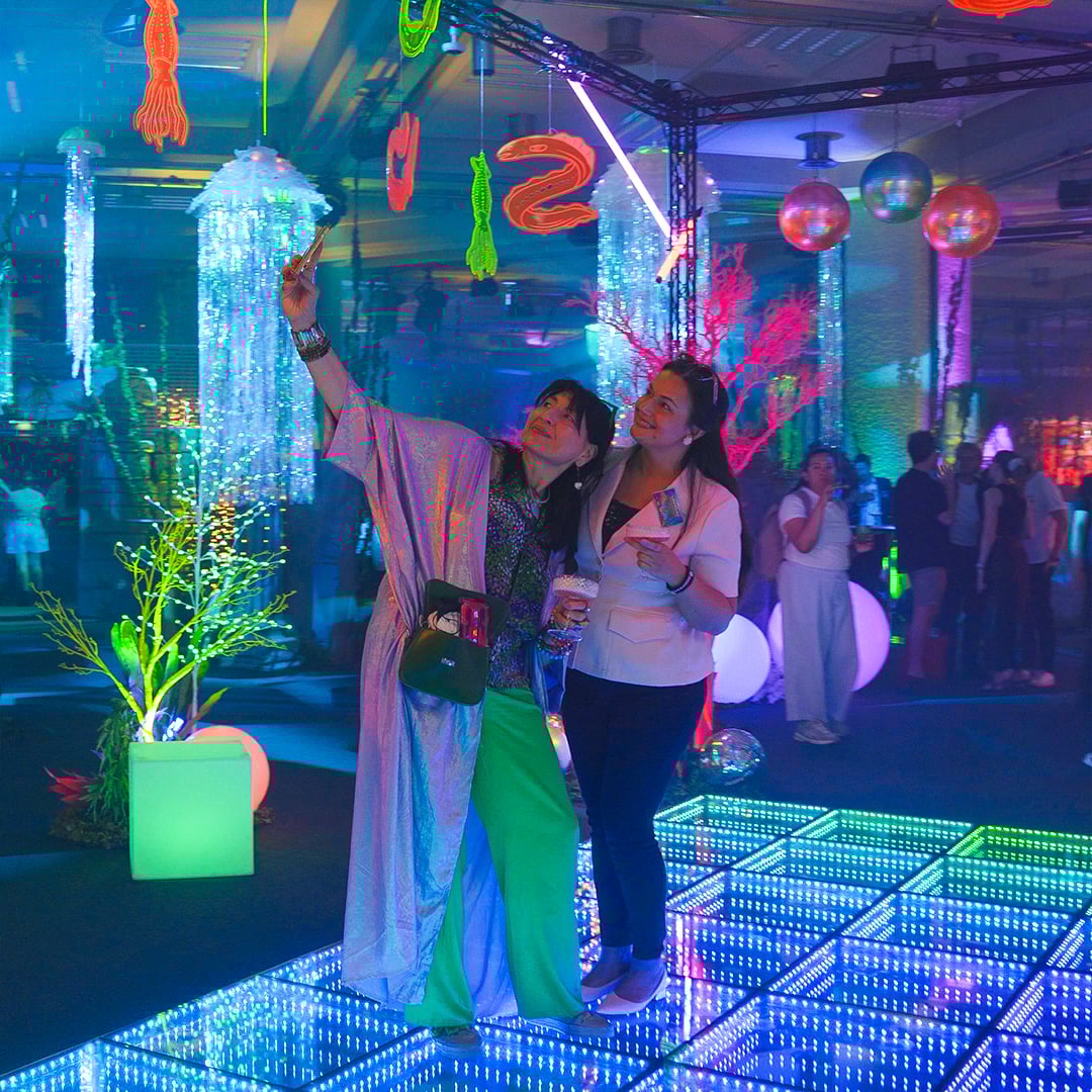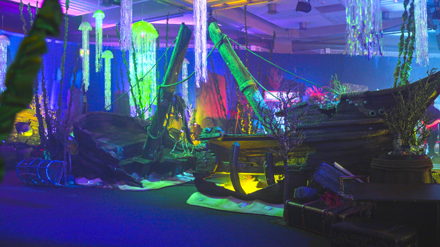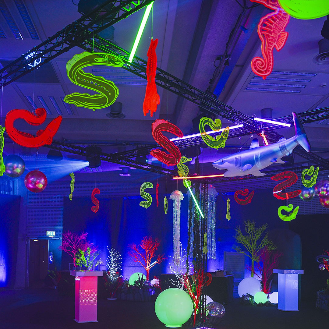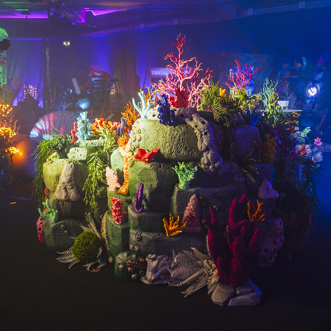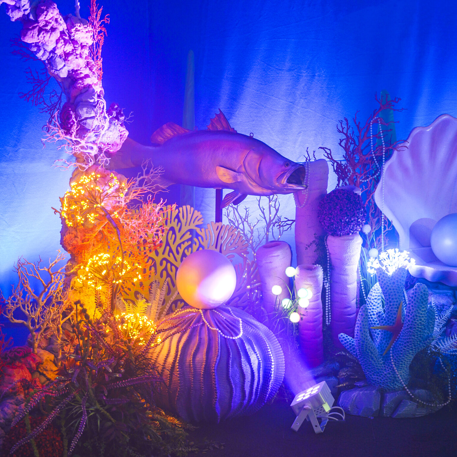 The wild card of the event. This bold space fused neon elements with glowing jellyfish, UV-reactive coral, and abstract sea creatures; offering a party atmosphere without breaking the thematic consistency. It gave guests something they didnโt expect from an underwater brief, and it worked.