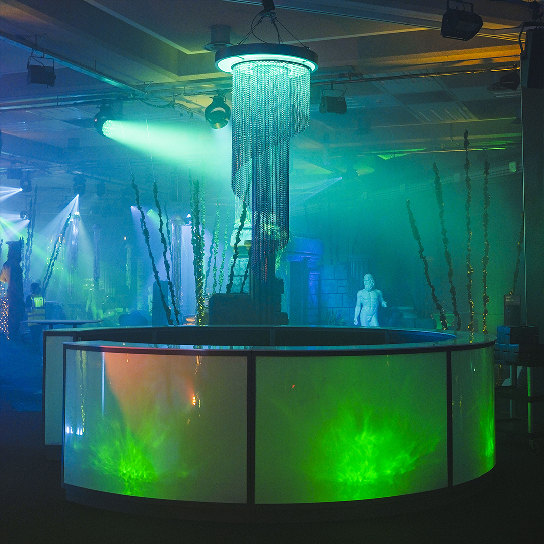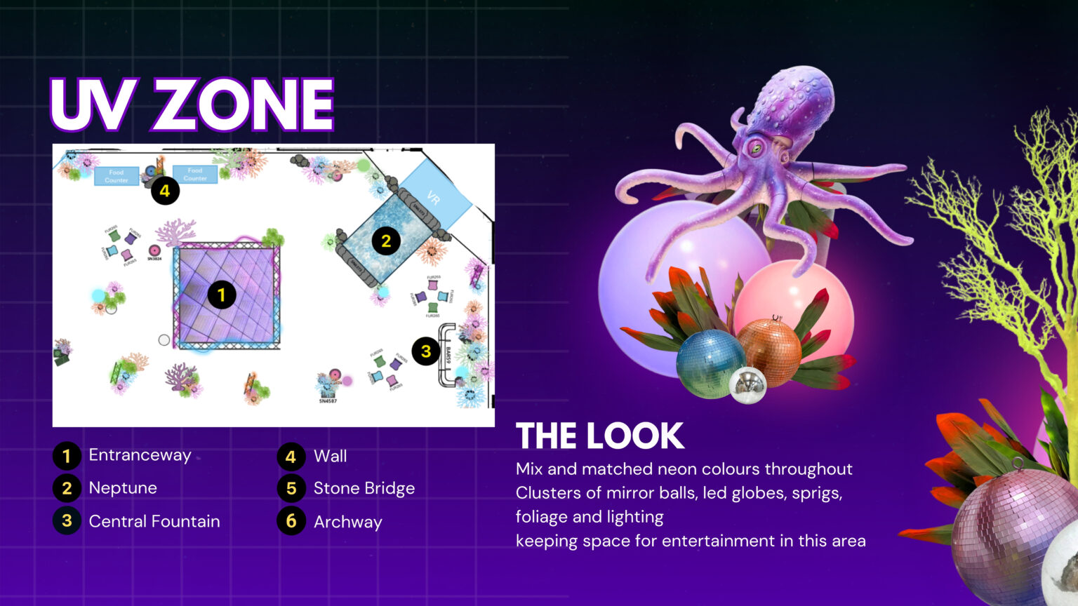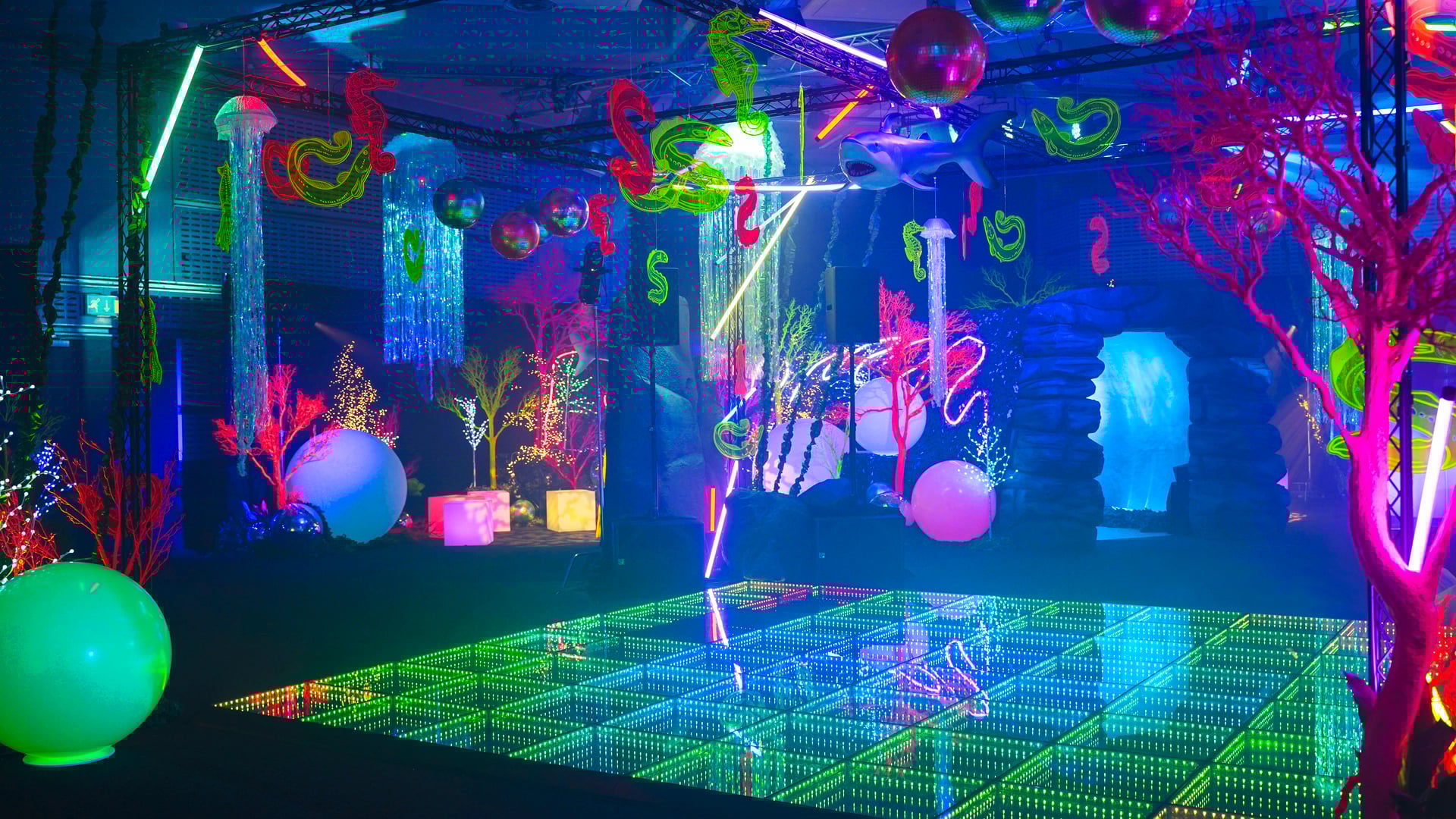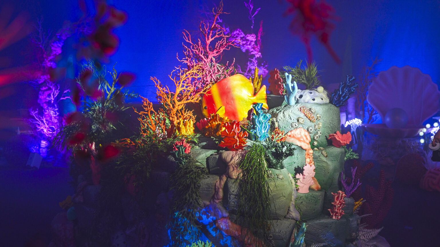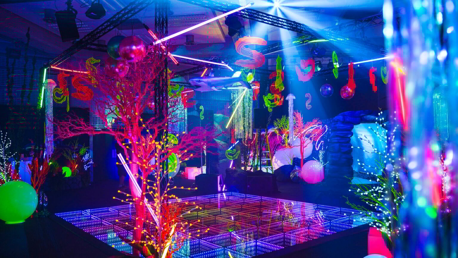 The wild card of the event. This bold space fused neon elements with glowing jellyfish, UV-reactive coral, and abstract sea creatures; offering a party atmosphere without breaking the thematic consistency. It gave guests something they didnโt expect from an underwater brief, and it worked.