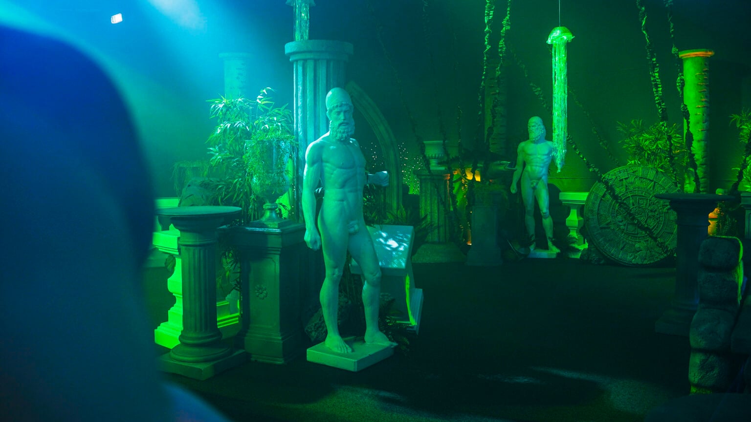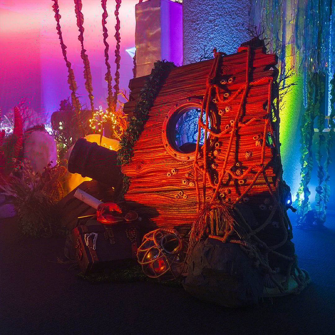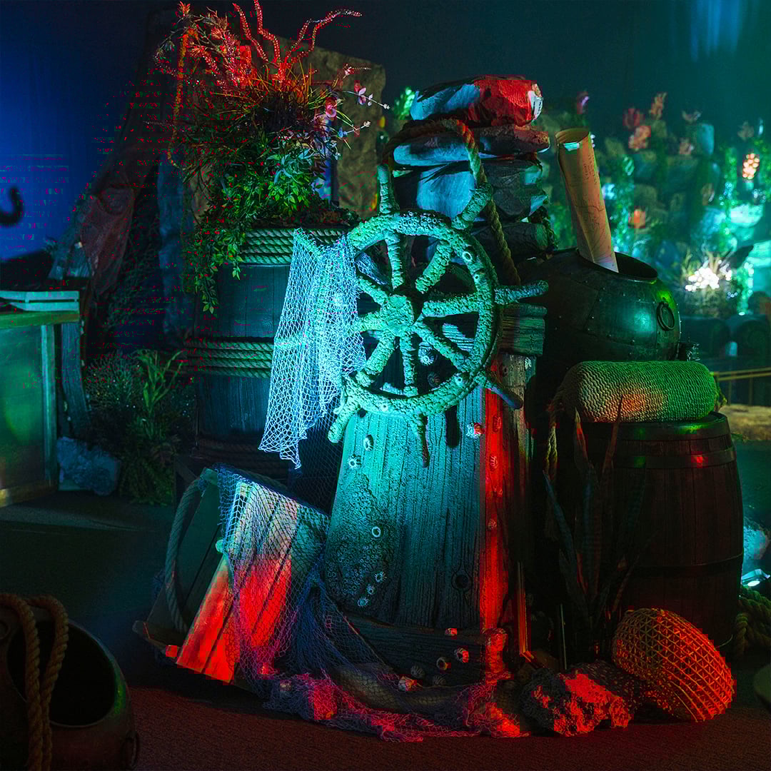 Tranquil lighting and cleverly repurposed props gave this zone a mystical tone. Soft purples, sea greens, and backlighting created the illusion of exploring ancient ruins through the haze of the ocean depths.