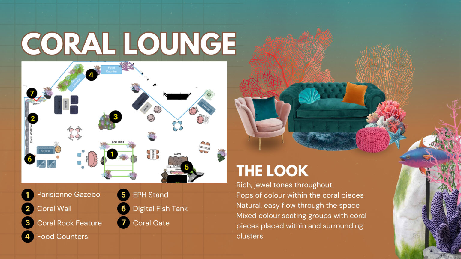 A jewel-toned chill zone designed for conversation, drinks, and discovery. A standout bespoke coral wall installation anchored the space, with a fully dressed gazebo creating a focal point. This became the key networking area for food, conversation, and brand interaction.