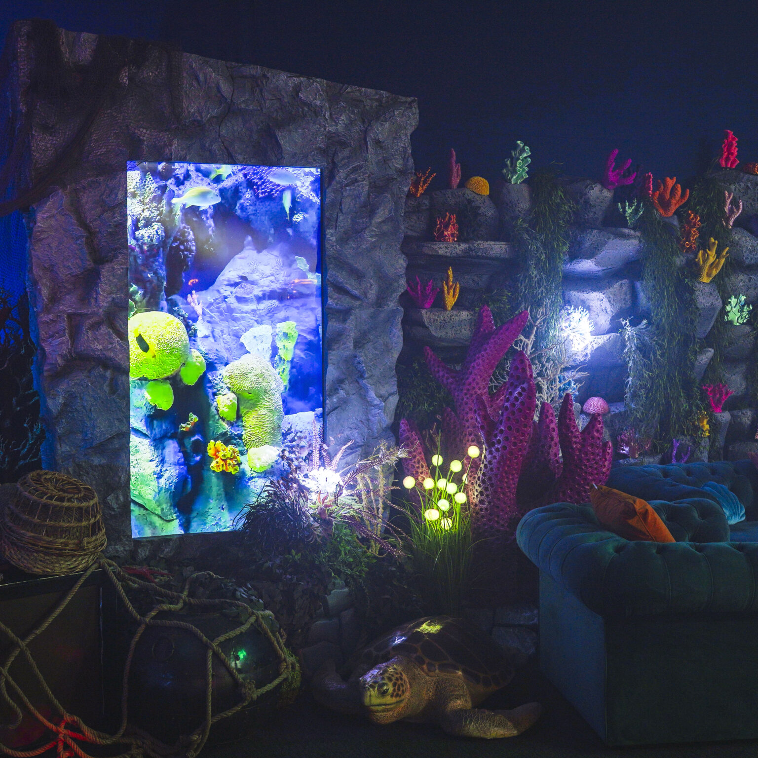 - Custom jellyfish, reef fish, and UV-reactive dรฉcor