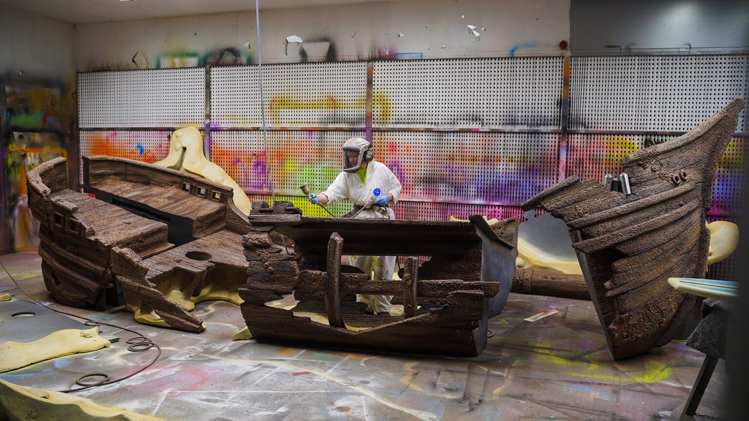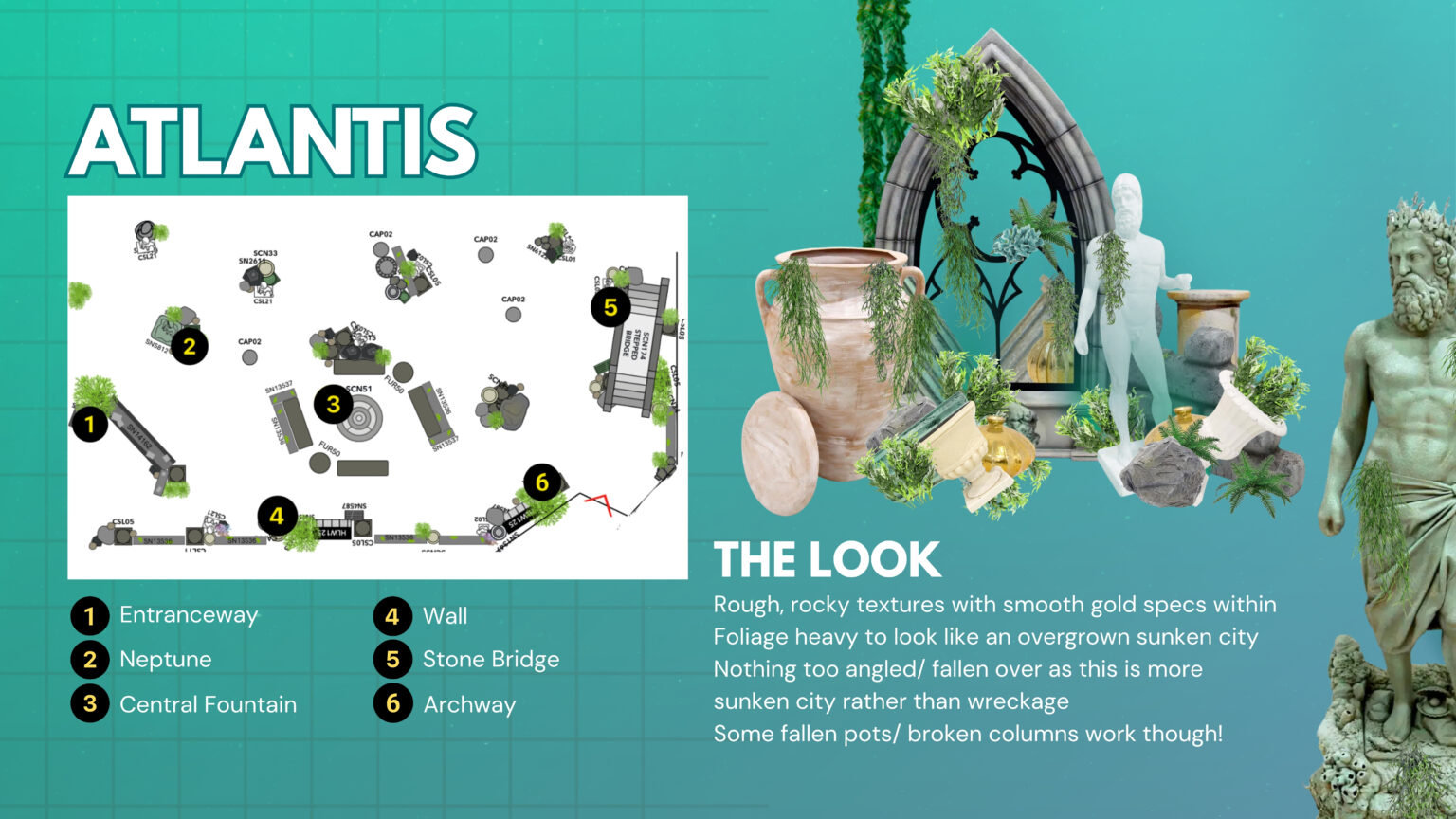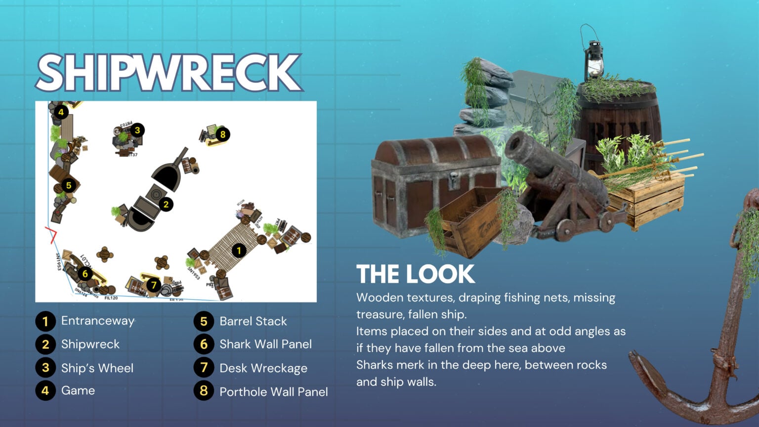 Dark, rustic textures, coral-strewn rocks, and buried treasure created the look and feel of a sunken galleon. It was the most densely styled area with rich layering, including netting, bottles, ropes, and pearls.
