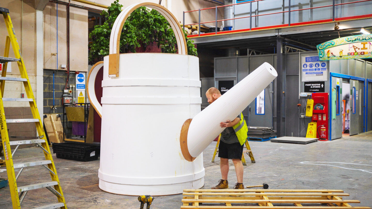 - Oversized trowels, vibrant flowers, and colourful, playful props