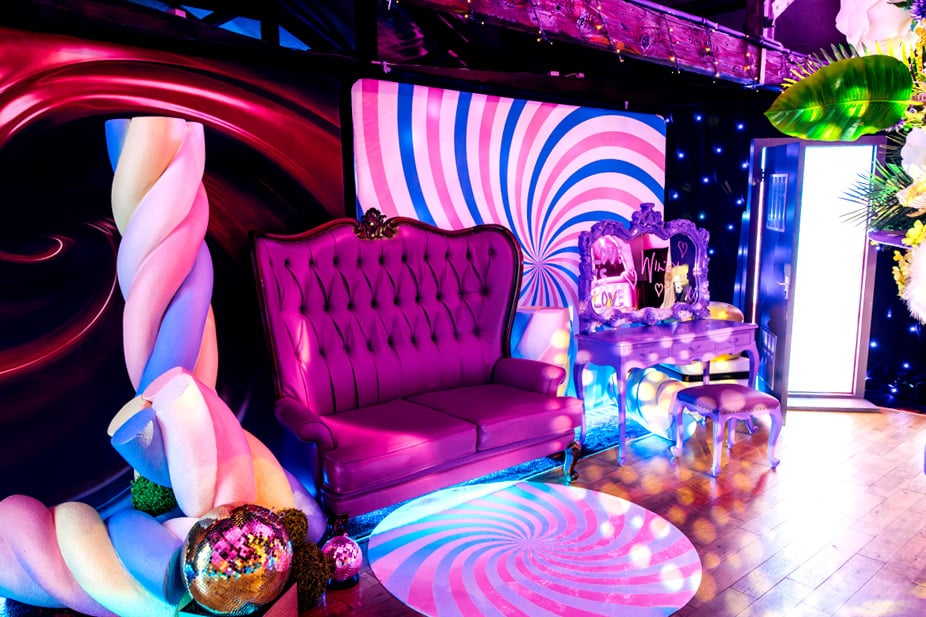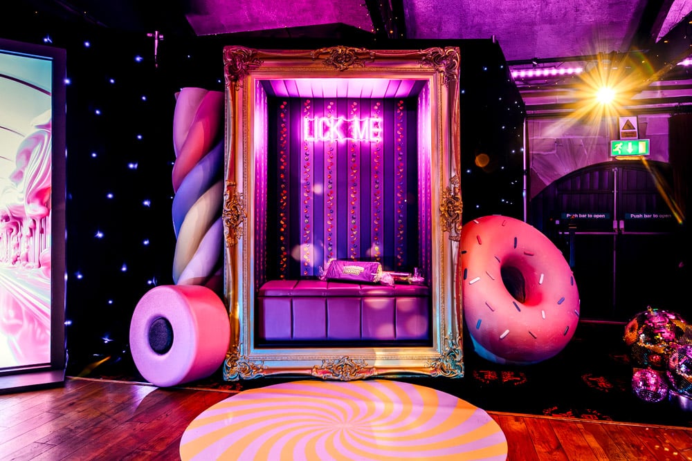 Guests posed on the iconic “Lick Me” framed seat, lounged on vibrant purple Chesterfields and wandered through illuminated Factory Gates. Each image showcases our chocolate factory themed decor, from oversized film-camera props to candy-cane walkways and light-box illusions that play tricks on the eye.