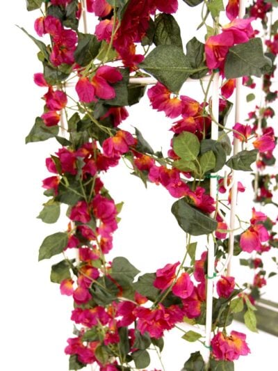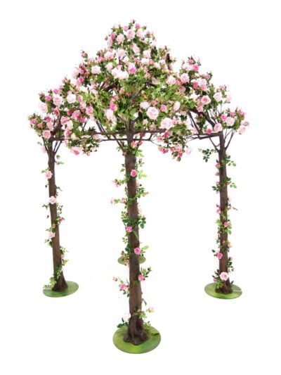 Interchangeable Botanical Archways adapt to seasons. Our 2.8 m Interchangeable Archway frames swap décor—choose from Bougainvillea, Wisteria, Fern, Holly, and more. For floral entrances without framework swaps, the Flower Dressed Arch (Pink Bougainvillea) and Pergola – Cream or Pink Roses deliver instant bloom. Cross-link to Prop Entranceways for sculptural tunnels.