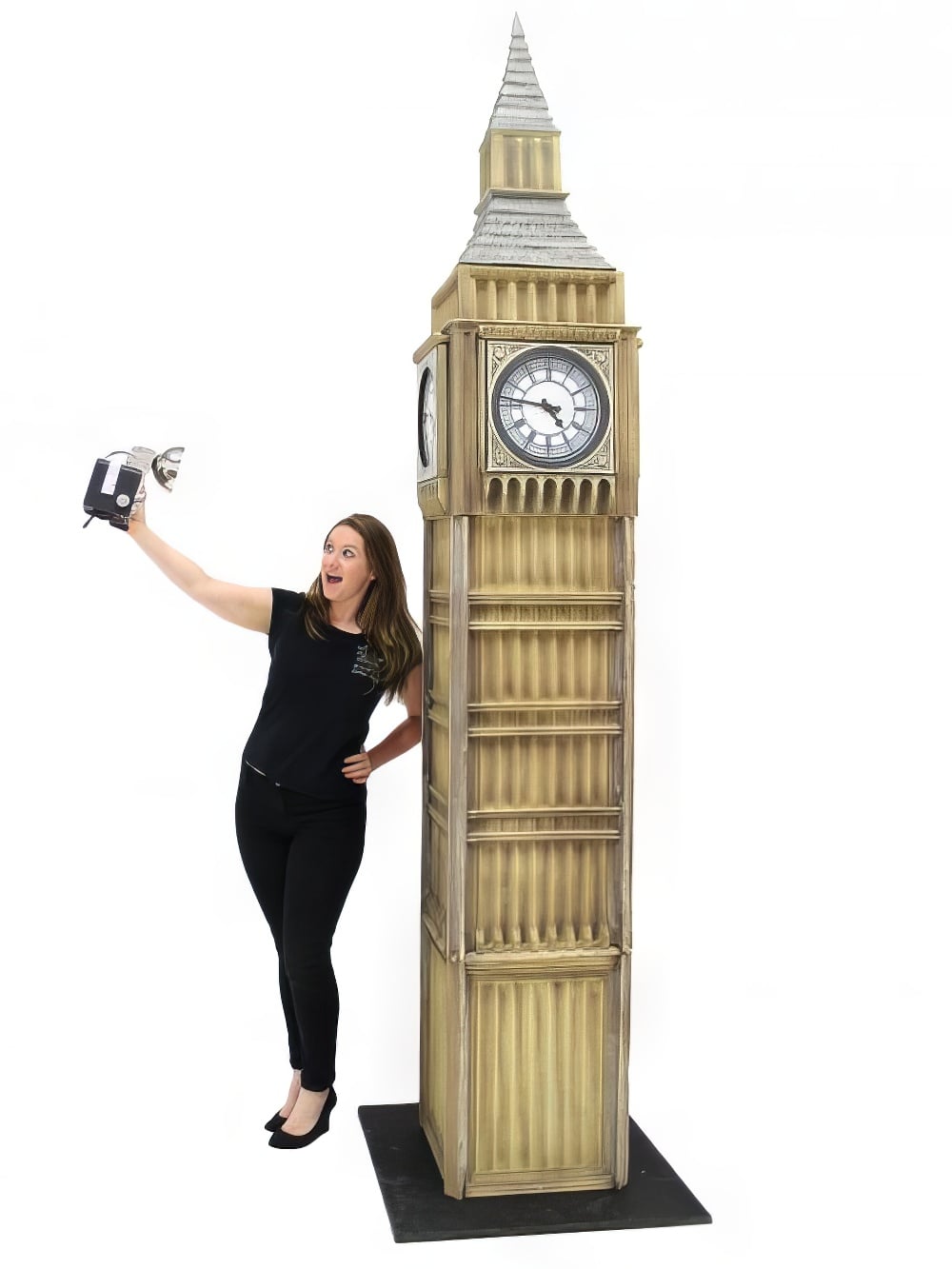 Choose from famous landmarks like Big Ben, Number 10 Downing Street entranceways, and traditional red telephone boxes. Add authentic London transport props such as the classic taxi cab front and iconic London bus.