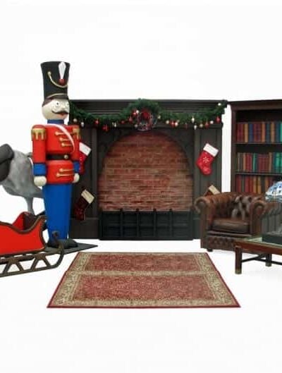 Begin with warm, characterful settings using stone fireplaces, chimney props, and a Santa Claus statue. Add depth with snowy Christmas trees, pine garlands, and vintage wreaths, styled with a Willow Tree Ring or Hessian Tree Skirt for authenticity.
