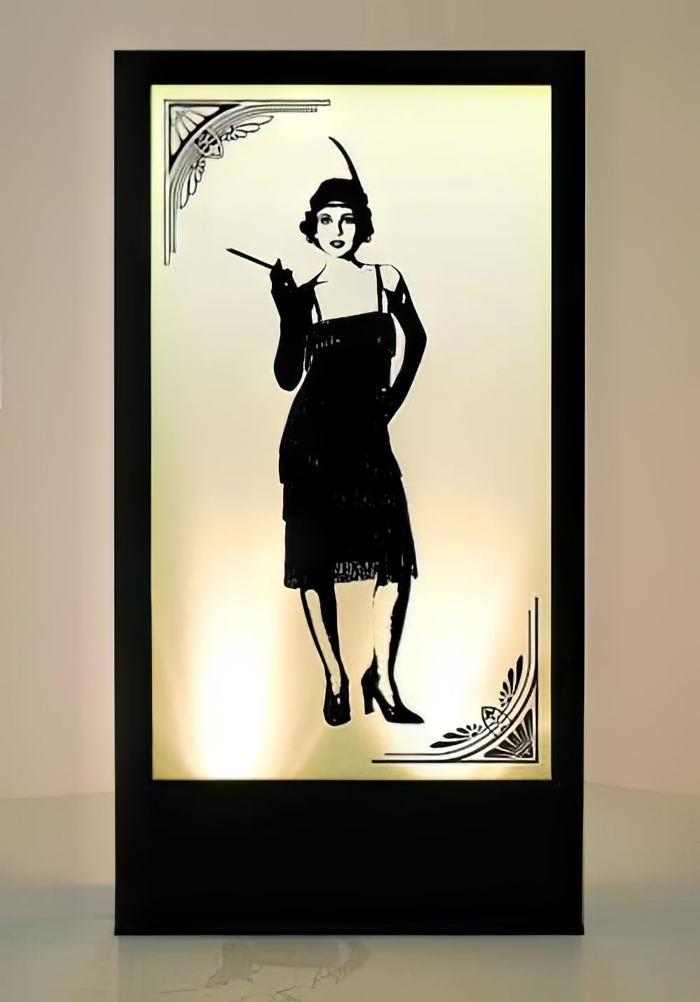 Lit silhoutte panel depicting a 1920’s flapper girl in standing pose. Perfect for your gangster, black and white, 1920’s or art deco themed event. Actual lighting colour ย can vary from that shown. All Parcan lights have a 1m lead and it is the responsibility of the client to provide extension leads if longer leads are required. Price quoted includes one supplied light. We offer a customised version of this product here.