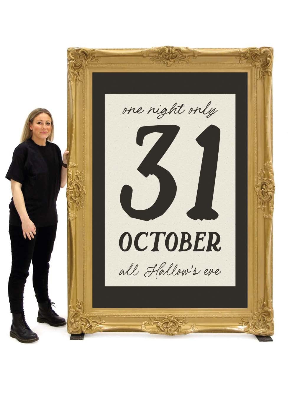 31 October Halloween Print in Gold Frame. Great theming for Halloween Themed events. Check out the full range of Halloween theme prints in giant frames.