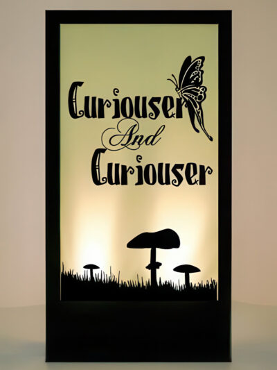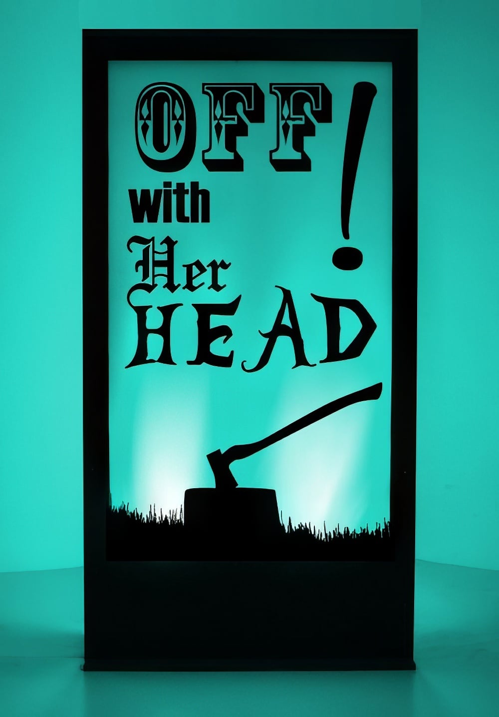 Alice in Wonderland Silhouette panel with iconic “Off with her head” text from the story. The perfect prop to hire for any Alice In Wonderland themed tea party!