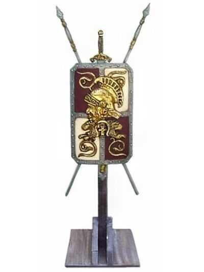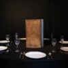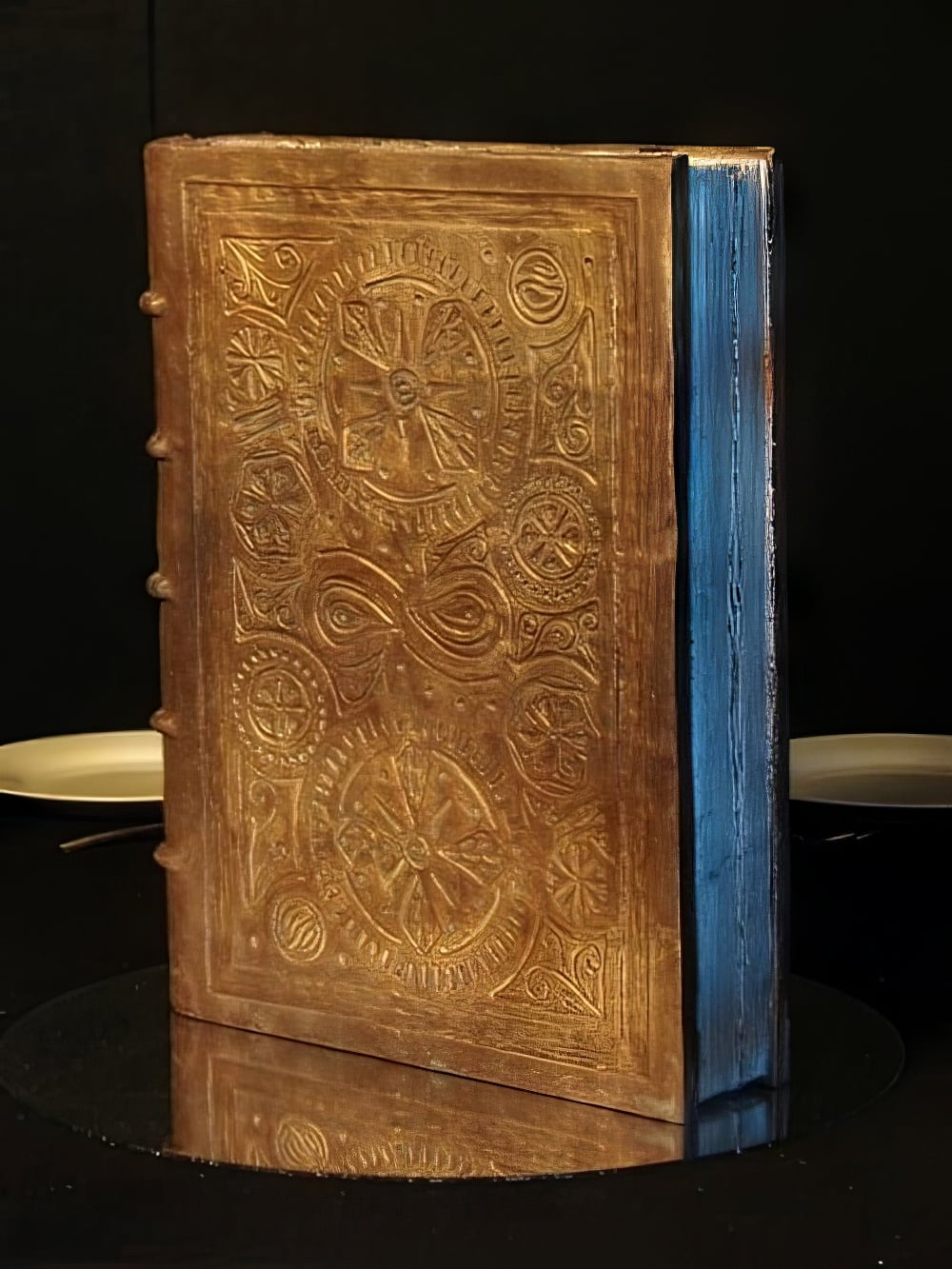 An ancient book complete with gold ornate markings and old ribbed spine suitable for a table centre or medieval themed events. Mirror disk base available at additional cost.