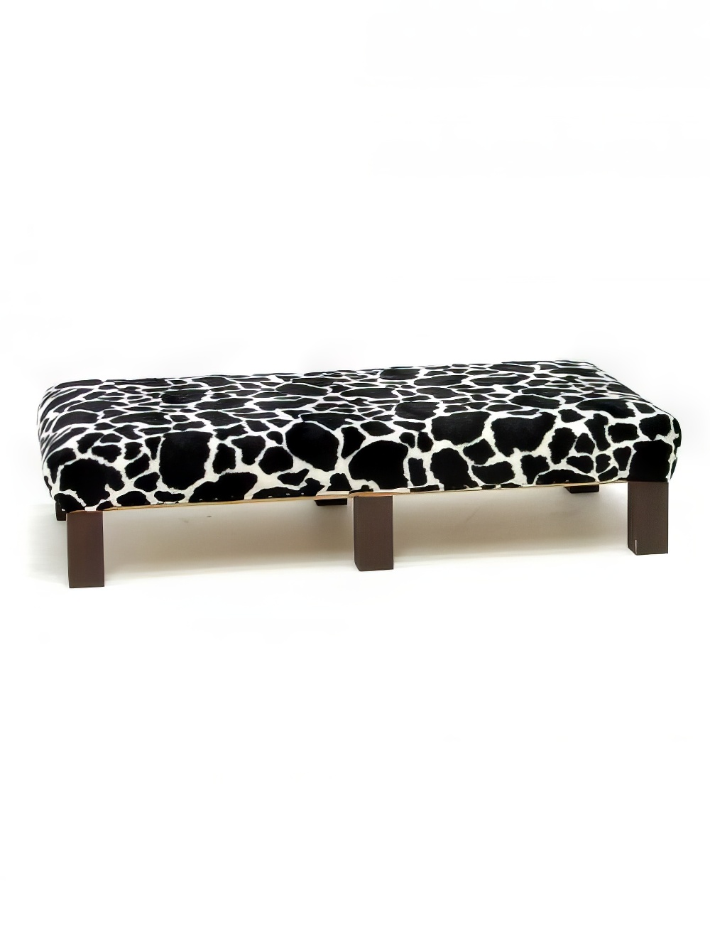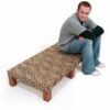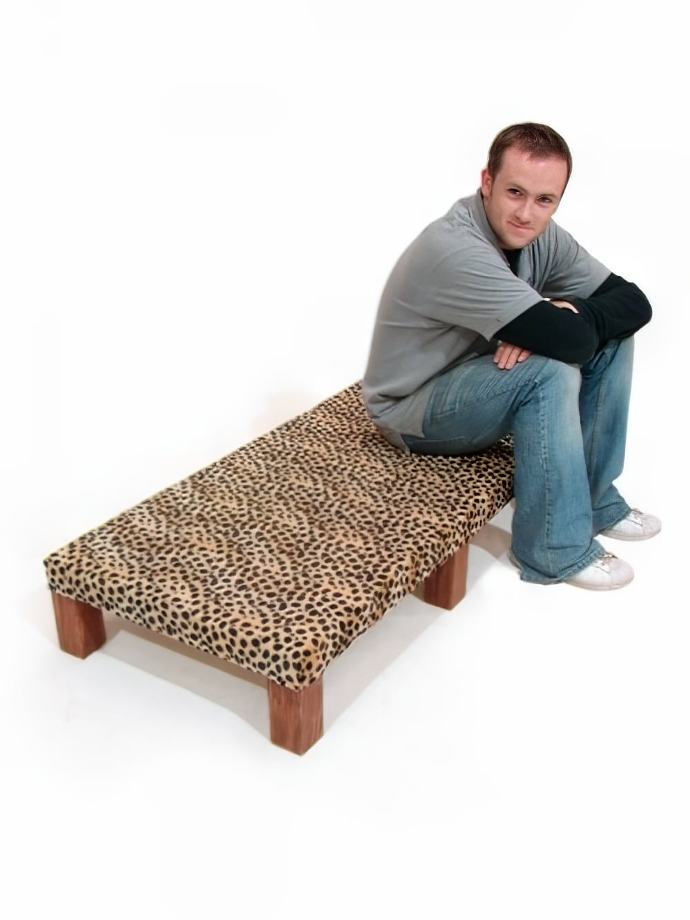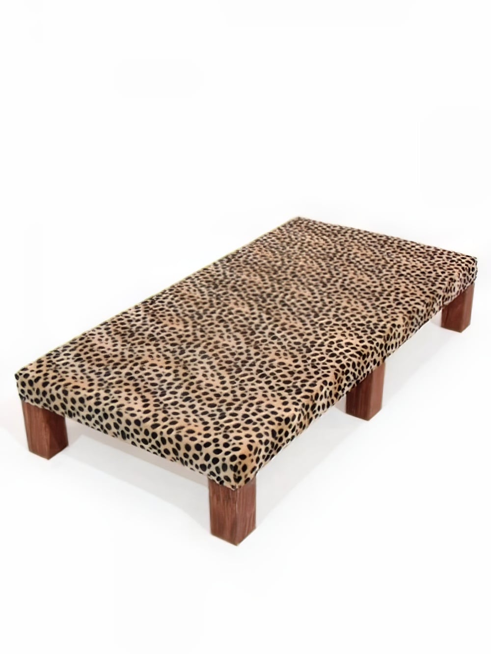 Animal Print Furniture Bench to hire. This low seating furniture solution is finished in a soft foam padding and covered in an animal print material design making it perfect furniture hire for any number of themed events including African Safari and Jungle event theme parties!