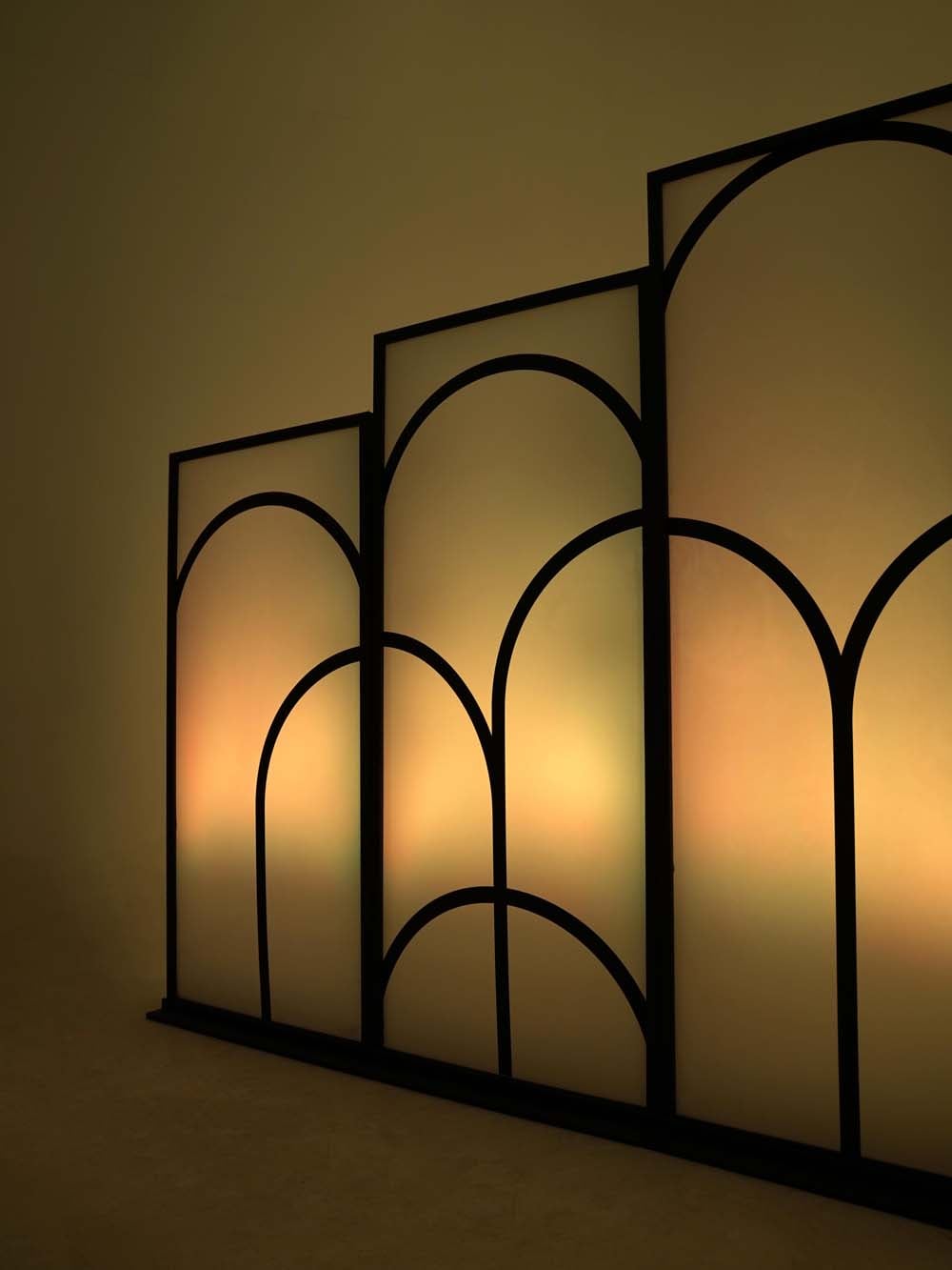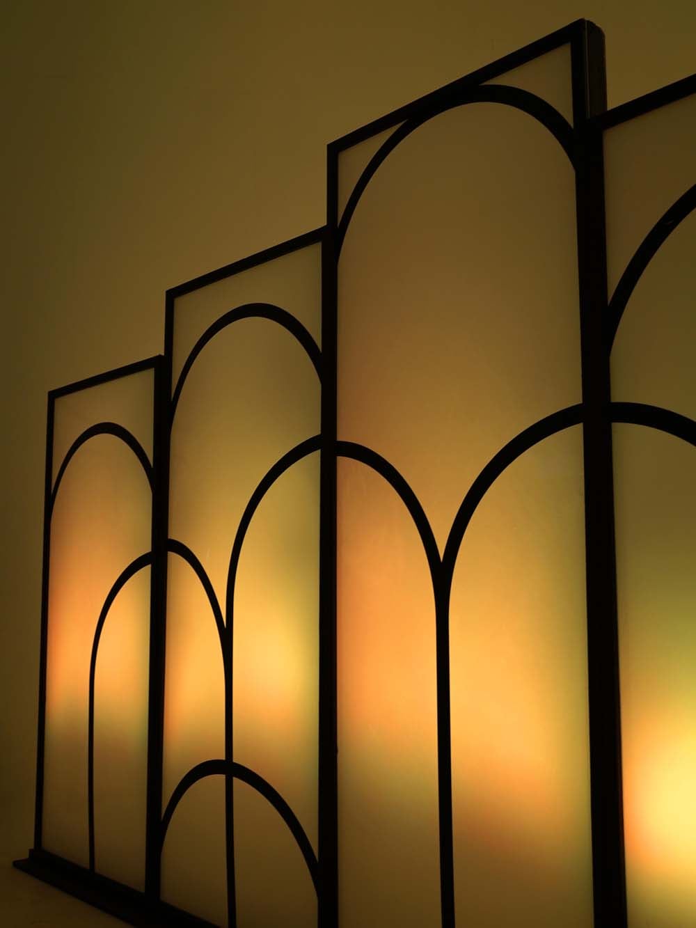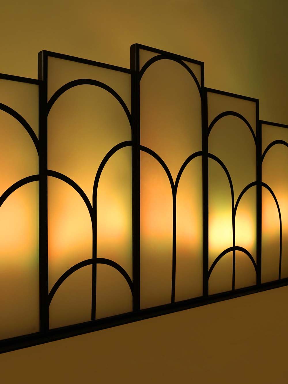 When lit from behind, the acrylic sheets illuminate with coloured lights looking particularly stunning.