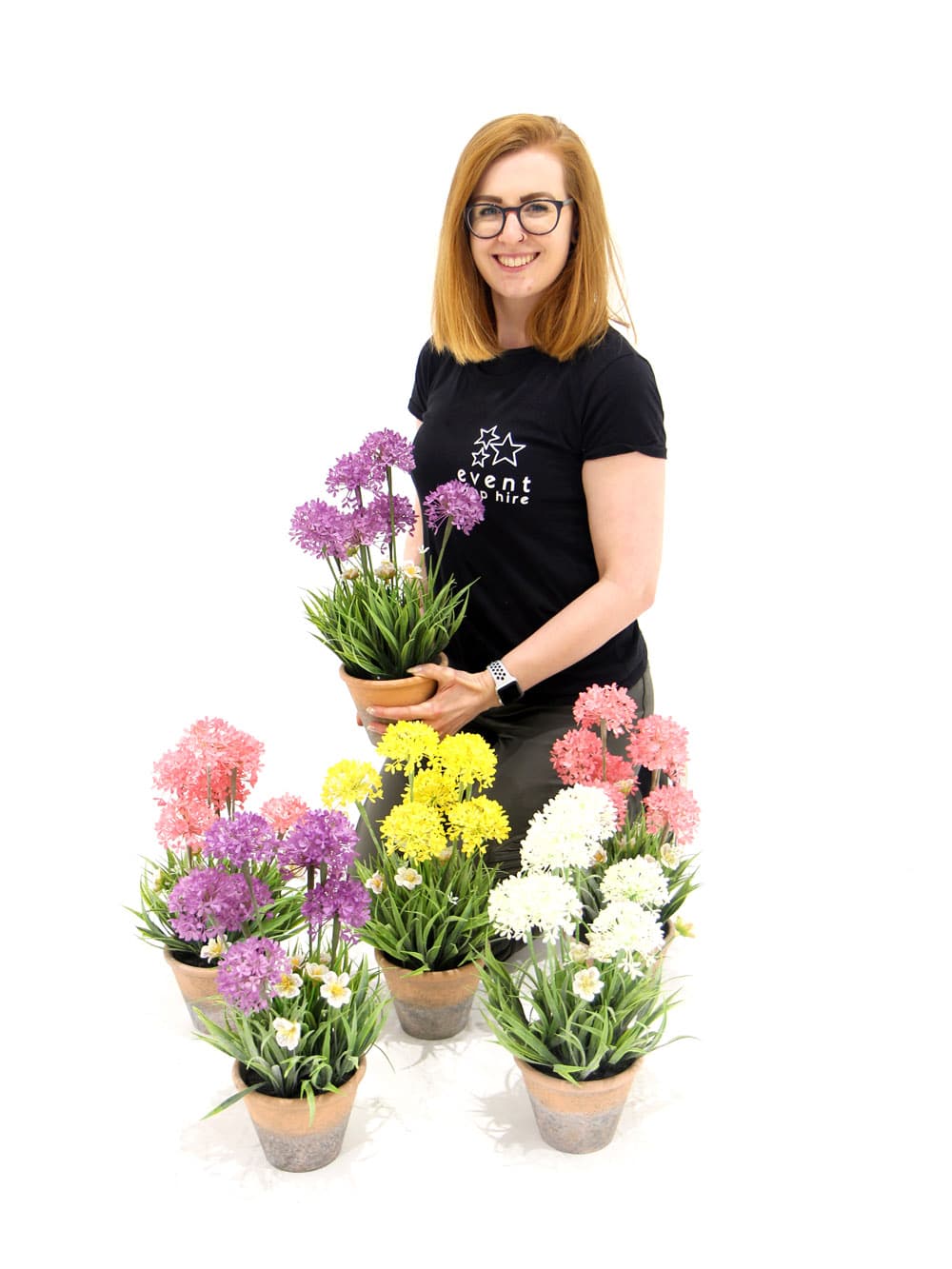 Artificial Potted Allium Flowers ย (Set of 6 Mixed Colours) for hire. These ย Artificial Potted Allium Flowers ย (Set of 6 Mixed Colours) for hire are the perfect plant dressing for any Summer-themed event.