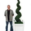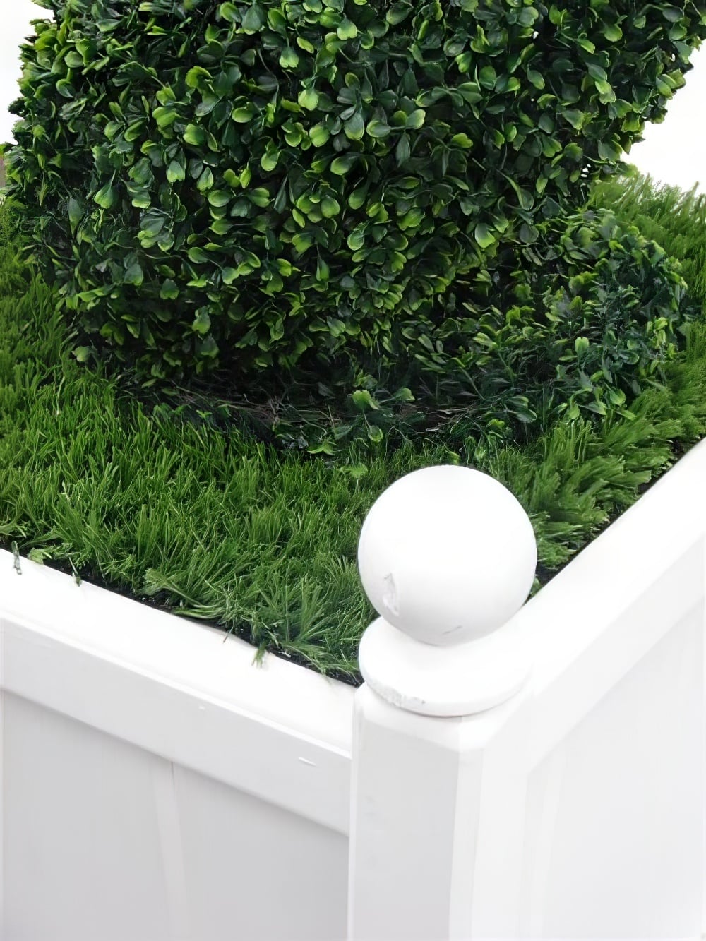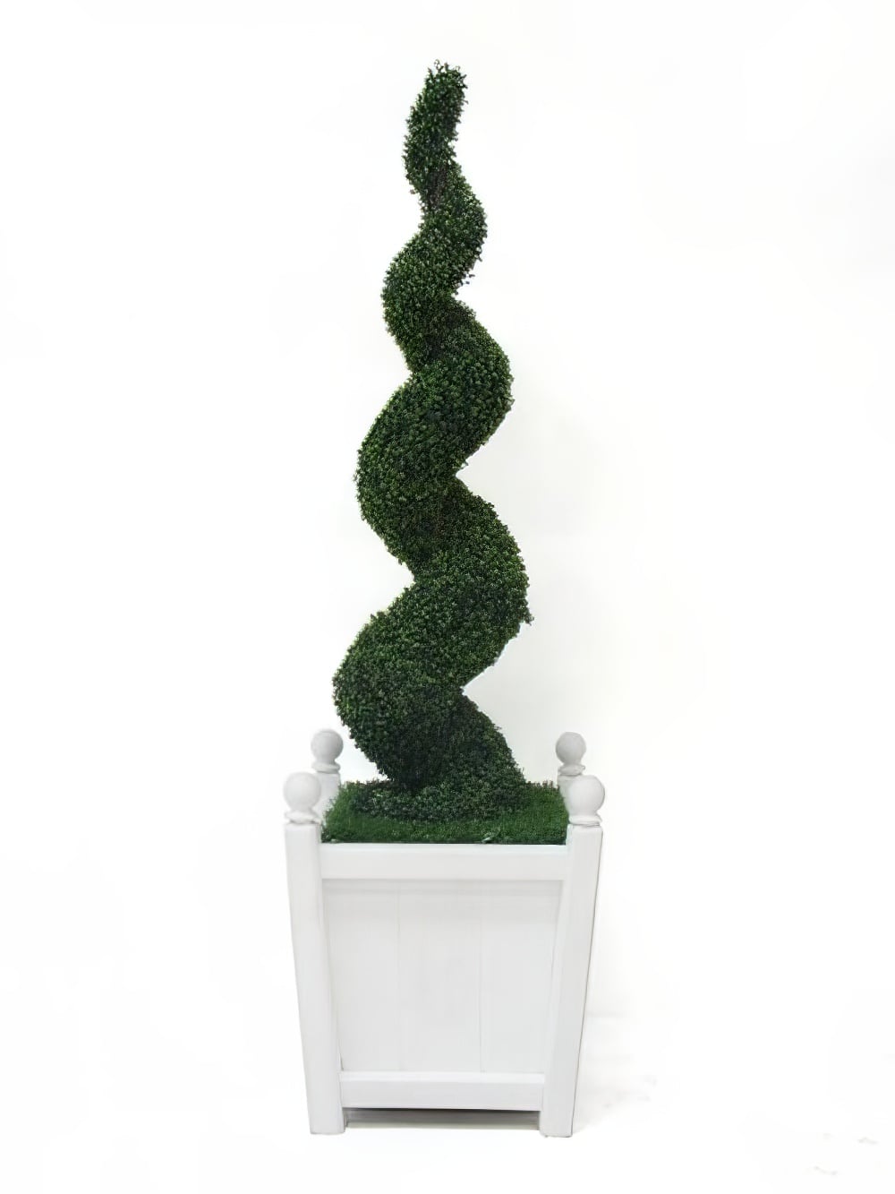 Imitation Topiary Tree Twists in classic green with grass lined wood planters base to hire.