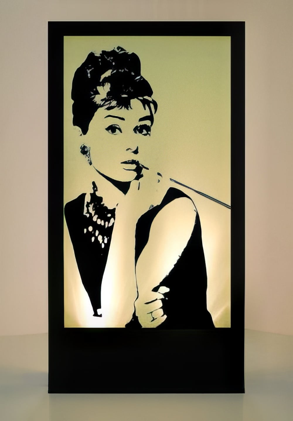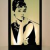 Lit silhouette panel depicting Audrey Hepburn. Actual lighting colour may vary from that shown. All Parcan lights have a 1m lead and it is the responsibility of the client to provide extension leads if longer leads are required.