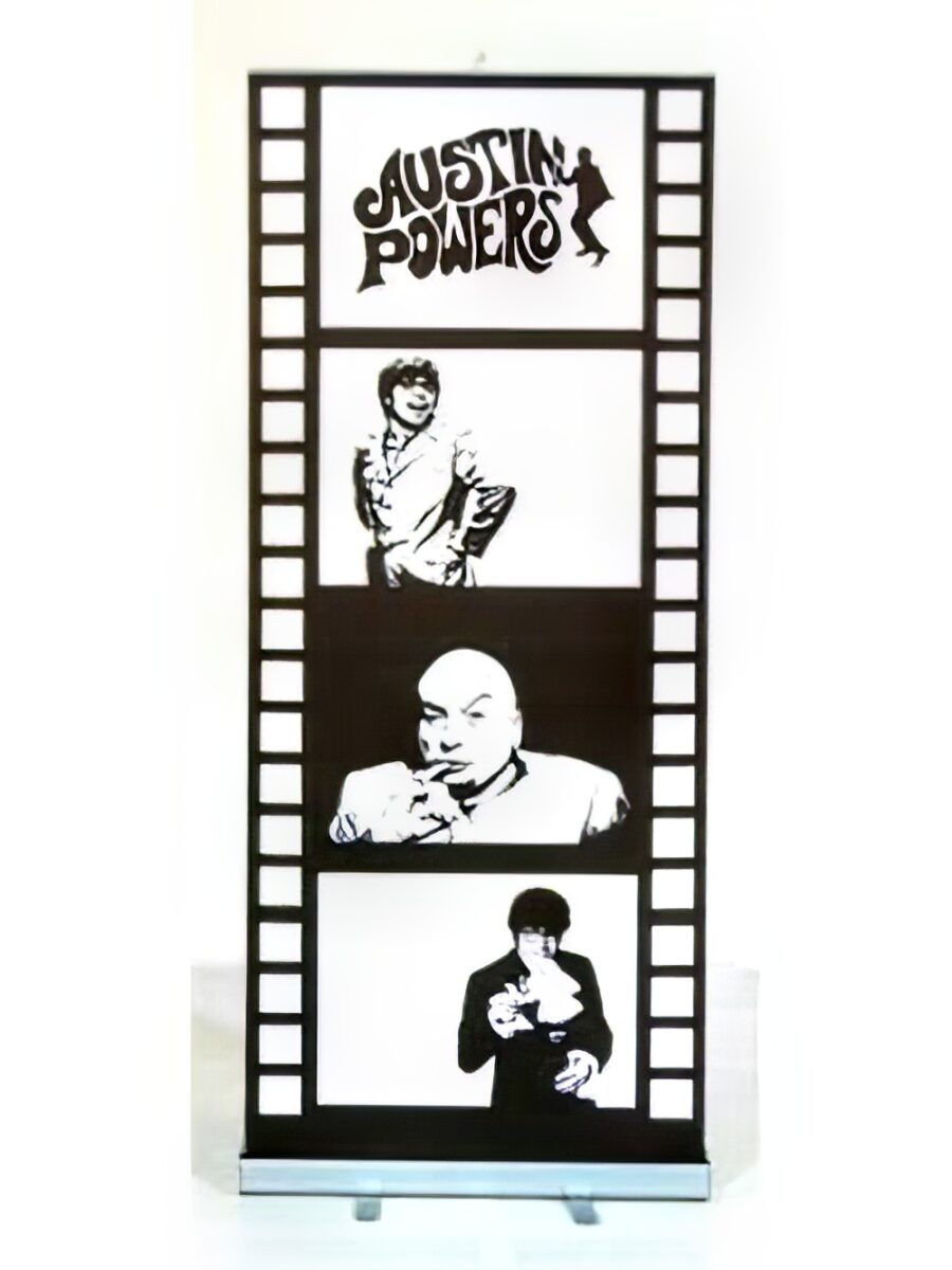 Film strip depicting 4 iconic Austin Powers images. …………do I make you horny baby? Well do I???