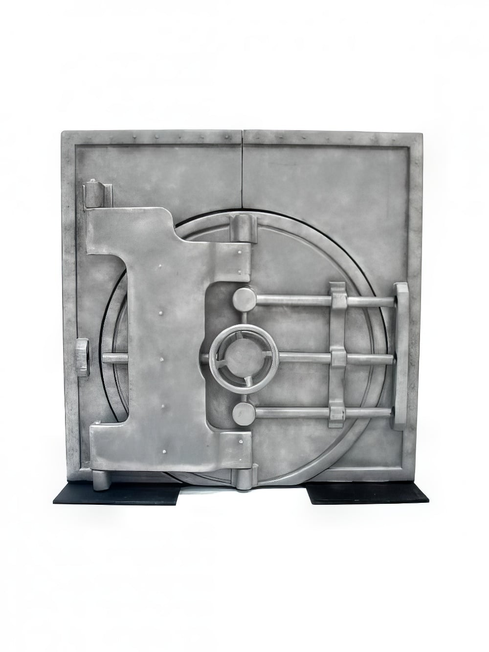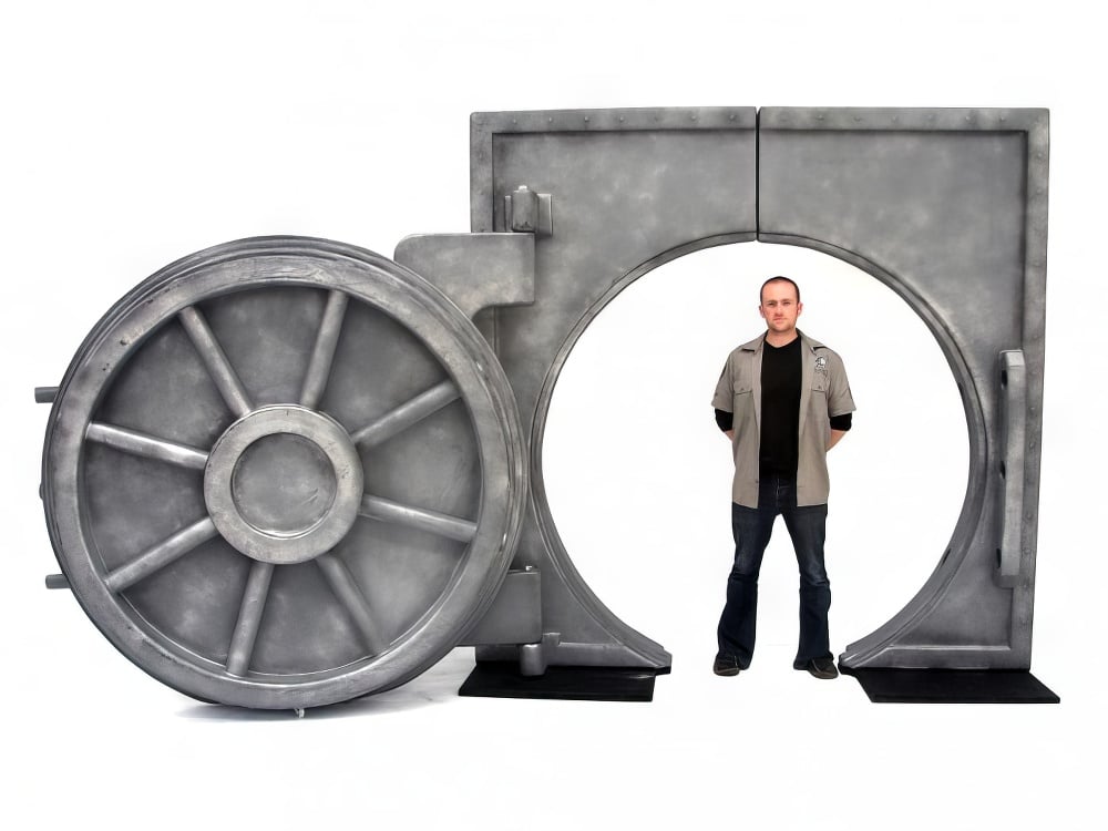 Bank Vault Entranceway Prop to hire. This bank vault entranceway has a fully functioning door and so would be perfect for welcoming your guests into your themed event in style be it for a James Bond Casino Royale Theme, Casino themed event or Viva Las Vegas party! Vault is delivered in ย 4 main pieces.