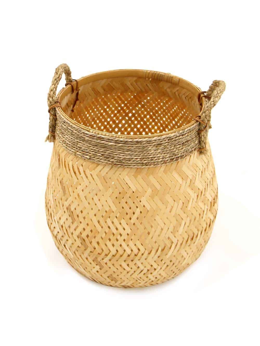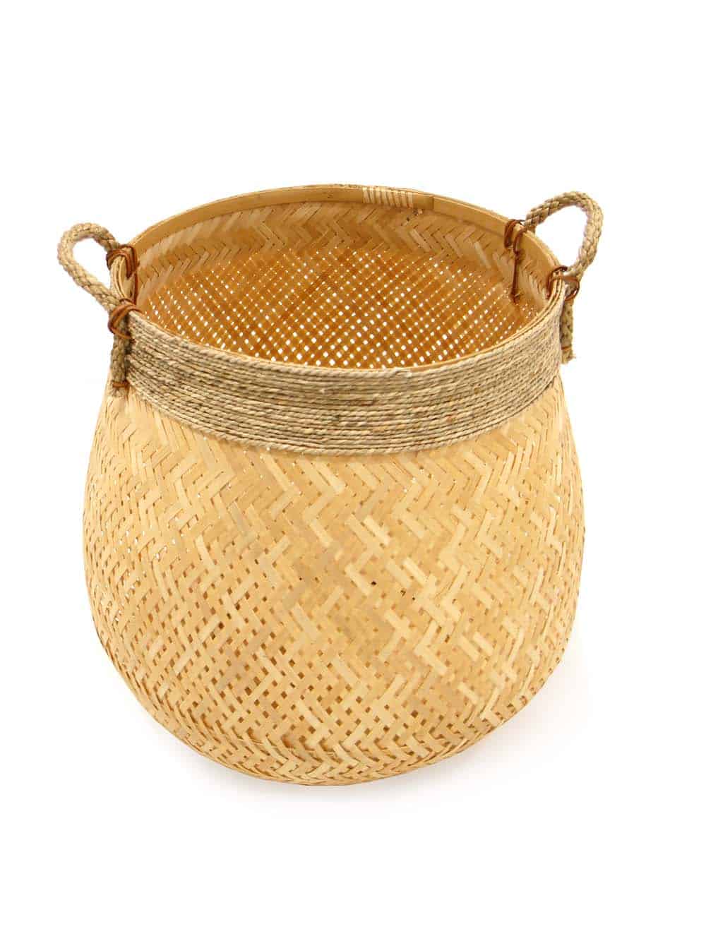 Baskets – Bamboo set of 2 for hire. Woven bamboo round baskets ย  in set of 2, with handles.
