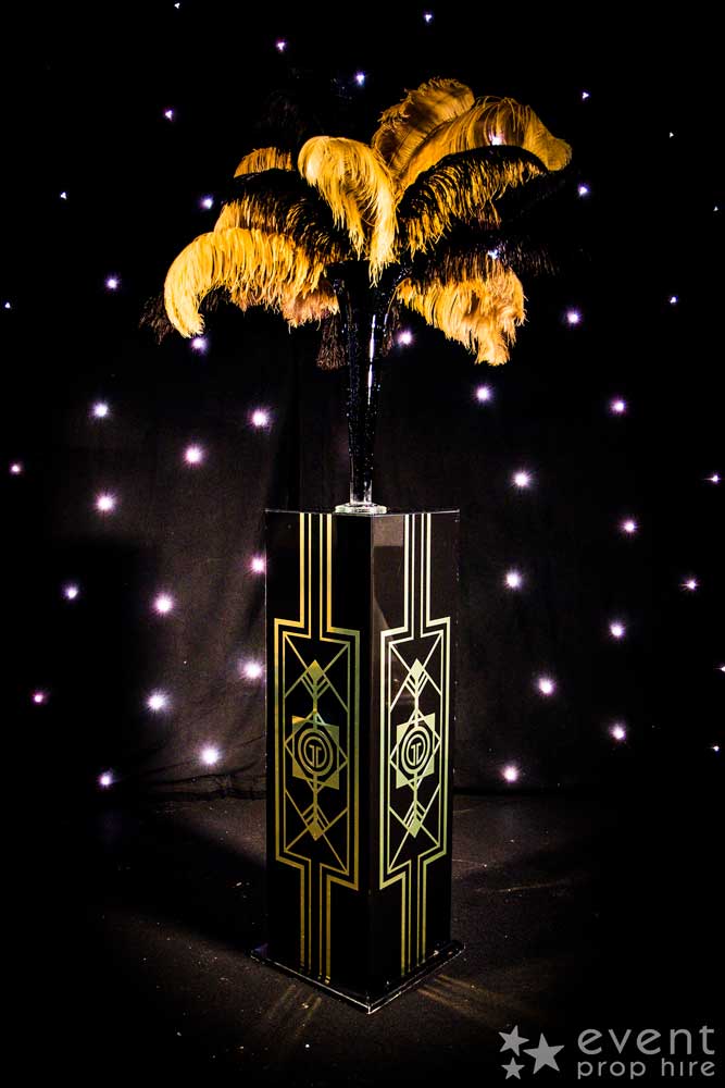 Black Gloss Plinth with Art Deco Style detailing to hire. This plinth is finished in a gloss black acrylic giving it a crisp reflective surface without the cumbersome weight of glass.