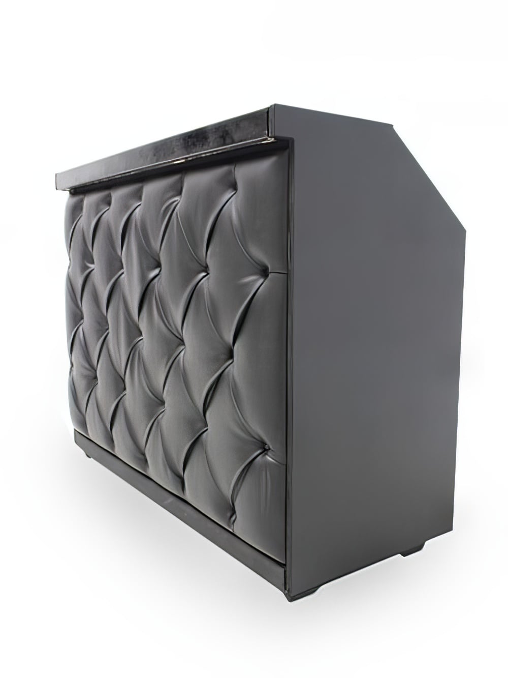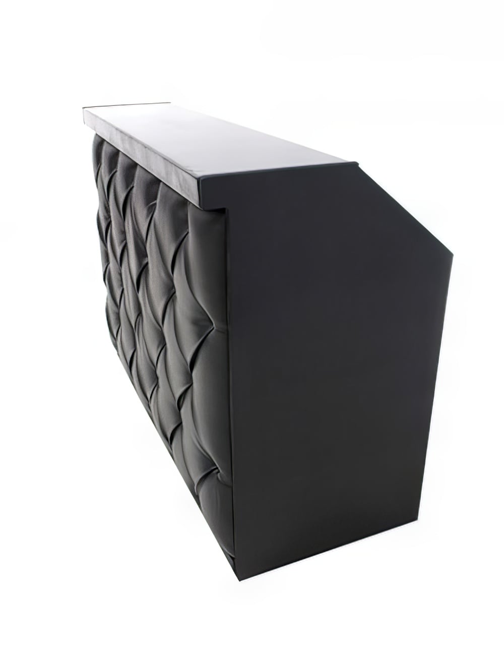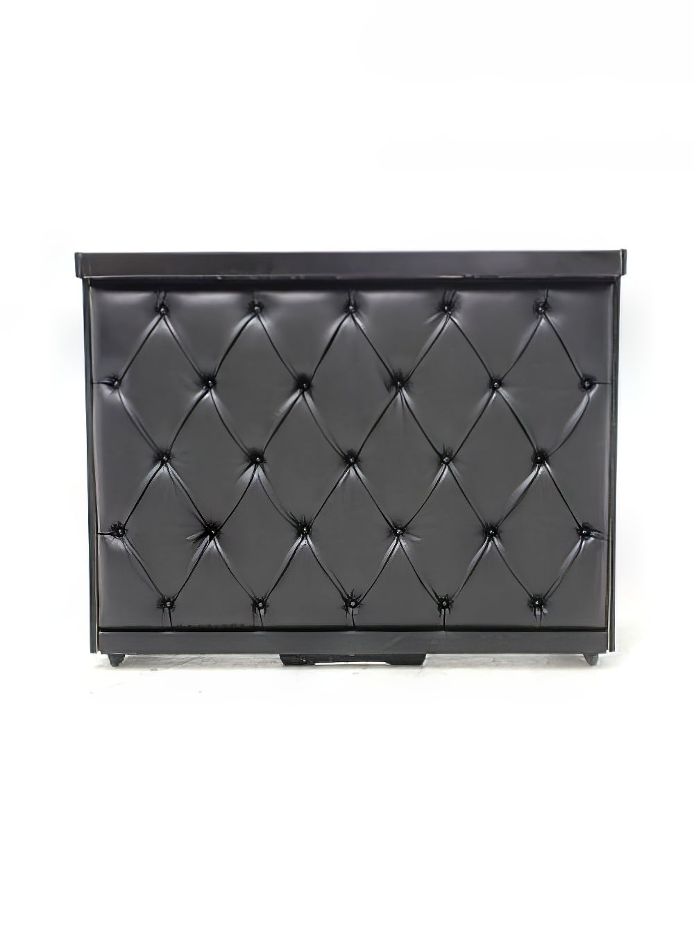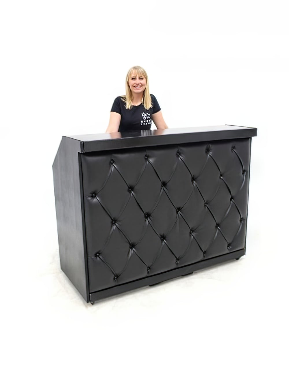 Black Chesterfield Bar for hire. This black Chesterfield bar is upholstered with a black ย leather effect vinyl ย and is a great item for all manner of themed events and parties. So whether you are re-creating a Gentleman’s Club or Nightclub at your event, need a black bar for a Halloween themed party or simply want a sophisticated bar from which to serve your guests, then this is the bar for you! We have lots of black Chesterfield furniture items that would complement this bar perfectly. Take a look at some below. The price quoted is for a 1.5m bar but but we can also supply this as a 3m and 4.5m length bar too. Please note that the price quoted here is for one section of bar (although several sections can be placed together to form a longer bar). Also, please note that the sides, front and top of the bar will be delivered separately to the bar framework for you to assemble on site yourself. 5m length bar too. Please note that the price quoted here is for one section of bar (although several sections can be placed together to form a longer bar). Also, please note that the sides, front and top of the bar will be delivered separately to the bar framework for you to assemble on site yourself.