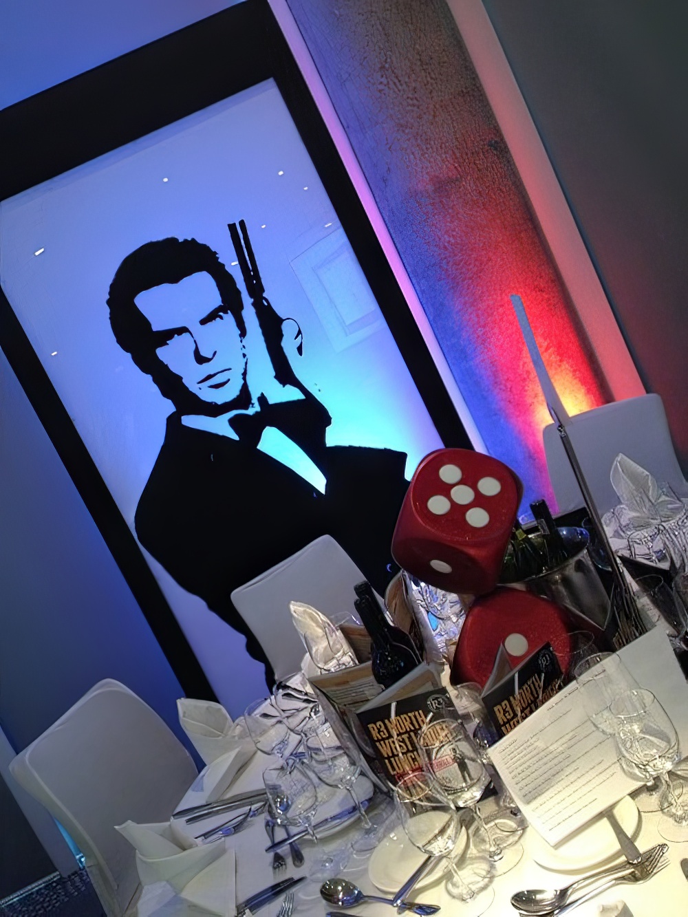 Pierce Brosnan silhouette panel in classic Bond pose. This and all our other Bond 007 props to hire will make great additions to your themed decoration at your 007 bond themed event party night. Lighting colour may vary from that shown. All Parcan lights have a 1m lead and it is the responsibility of the client to provide extension leads if longer leads are required.