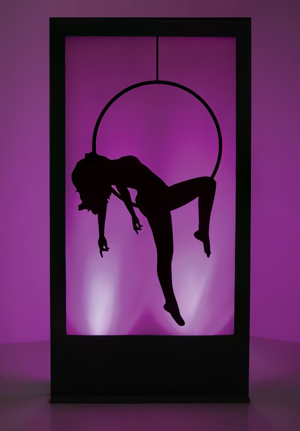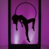 Burlesque Silhouette Panel to hire. Depicting a burlesque girl inside a hoop, this silhouette panel would be perfect lighting and prop hire for any burlesque themed event party. Lighting colour may vary from that shown.