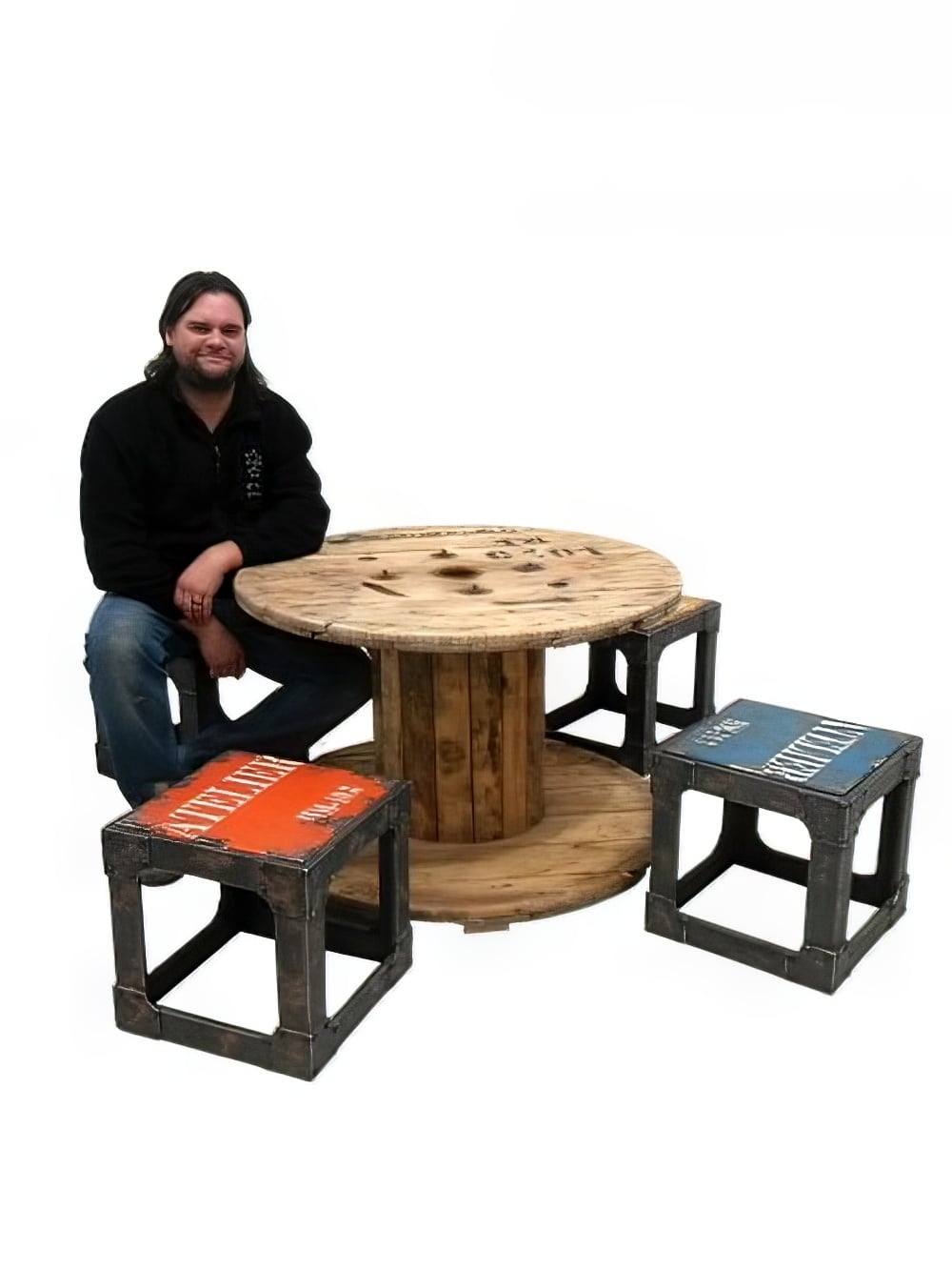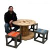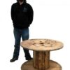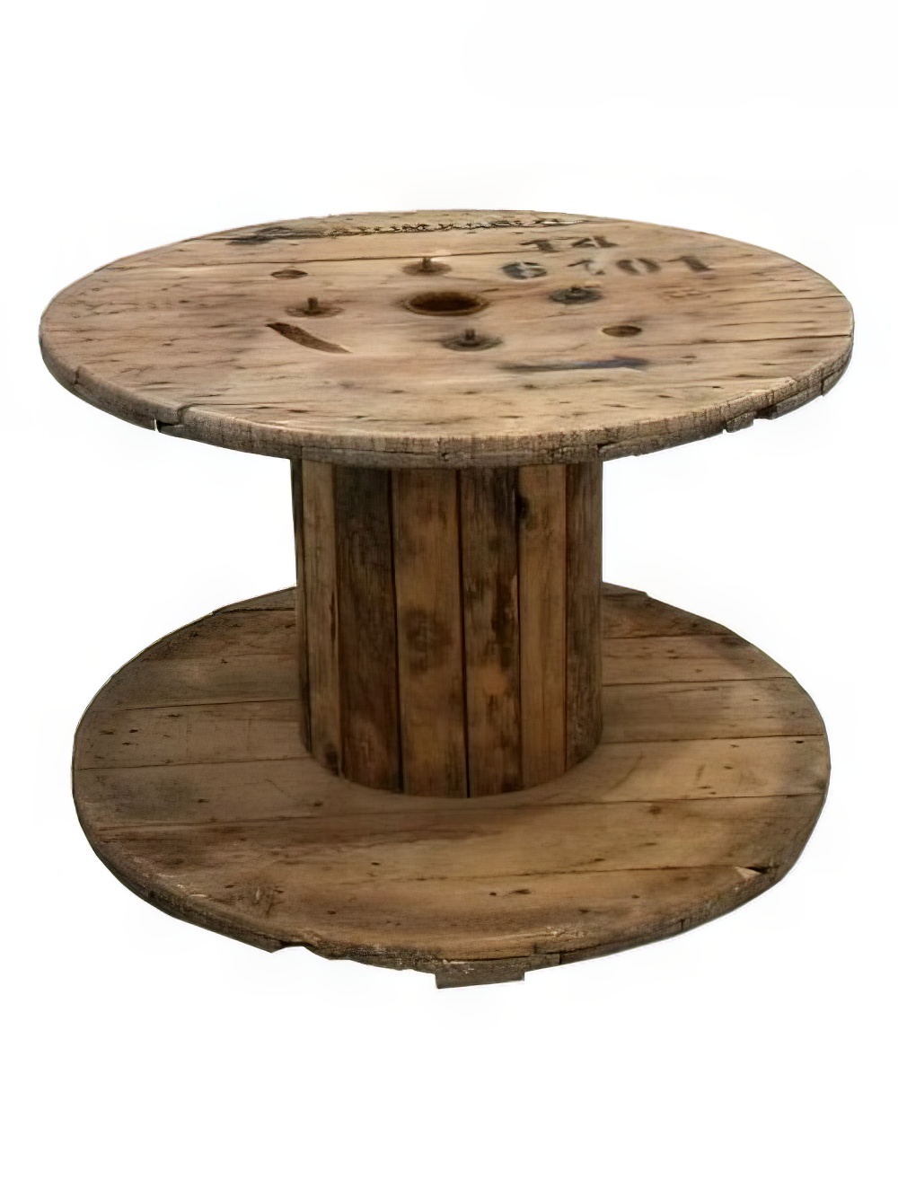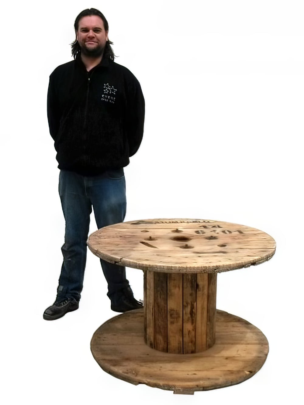 Cable Drum Table for hire. These tables are fantastic rustic items that would look great within a whole variety of themes from Industrial, Apocalyptic or Pirate, right through to Steam Punk. We offer a range of stools and other prop items that would really complement these tables.