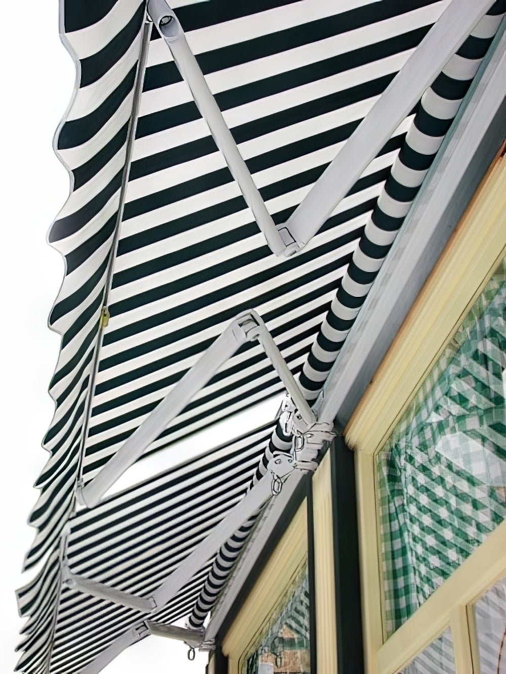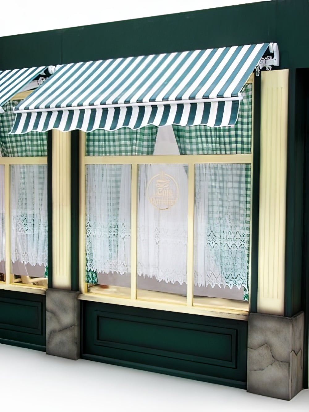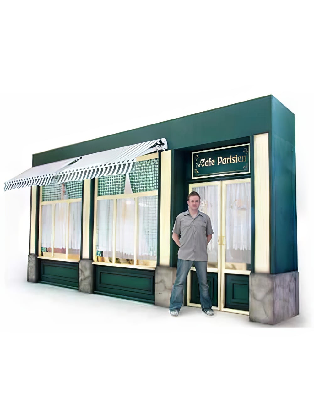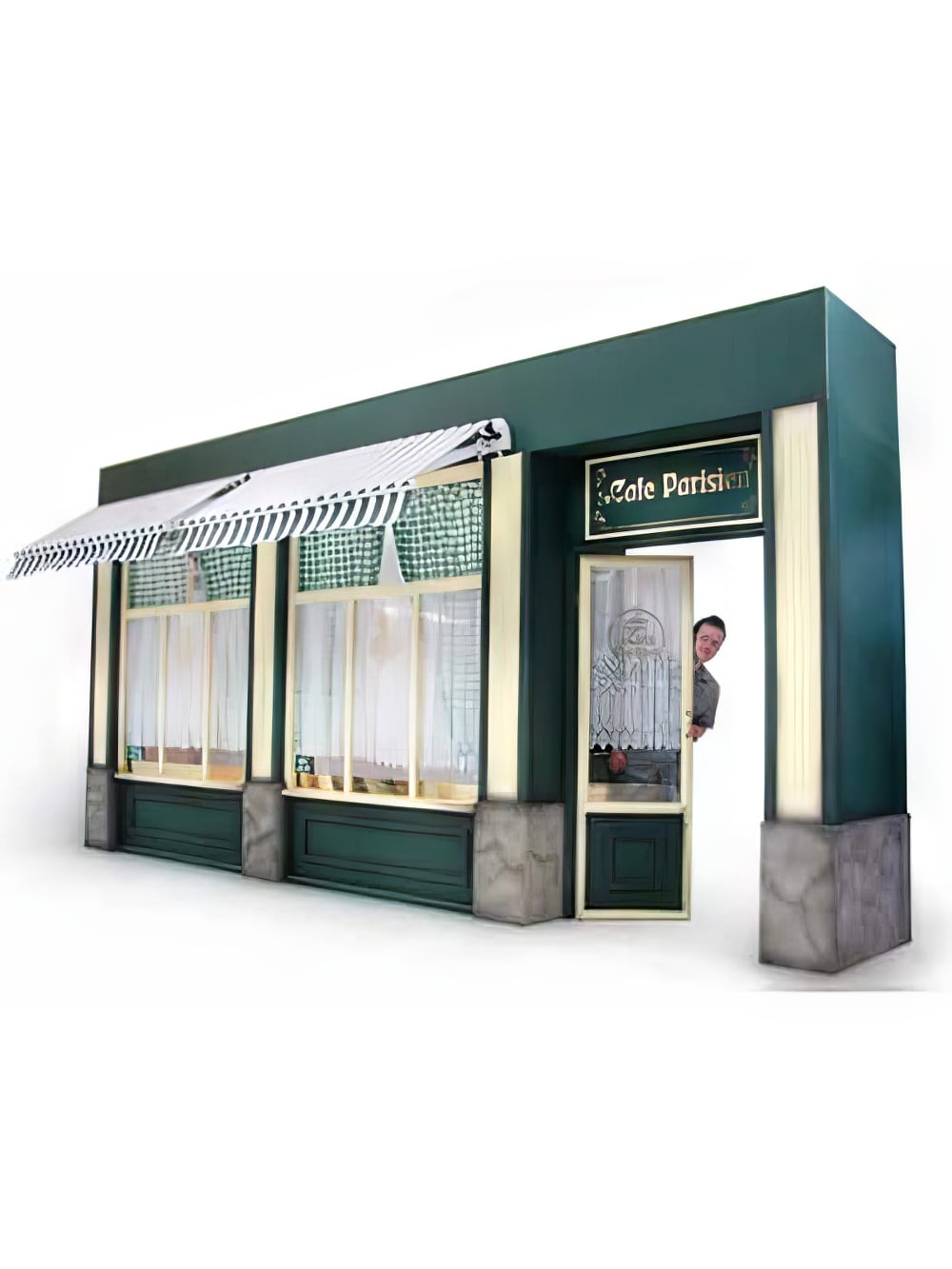 Cafe Bistro Front to hire with working retractable awnings. This cafe front is built from flat pack and is not recommended for dry hire unless you have your own onsite crew or request the EPH Creative installation service. Perfect prop hire for any Parisian or French themed event or party.