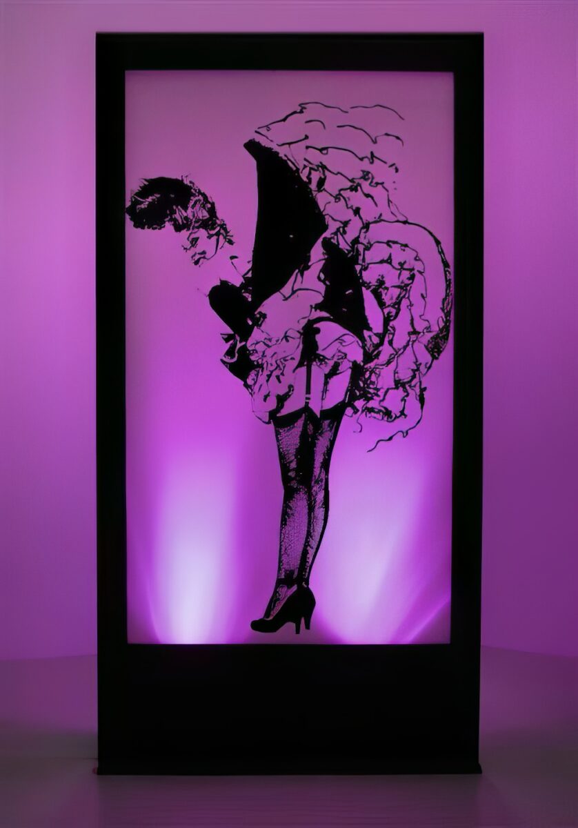 Cancan Dancer Silhouette Panel to hire. This is a back-lit silhoutte panel depicting an image of Cancan dancer. This, and all our other Parisian Burlesque ย themed props to hire, will make great additons to any Parisian Burlesque or Cabaret themed party or event. Please note that the actual lighting colour may vary from that shown. The prop is supplied with a colour changing ย Parcan light that has a 1m lead and it is the responsibility of the client to provide extension leads if longer leads are required. The price ย quoted includes one supplied light.