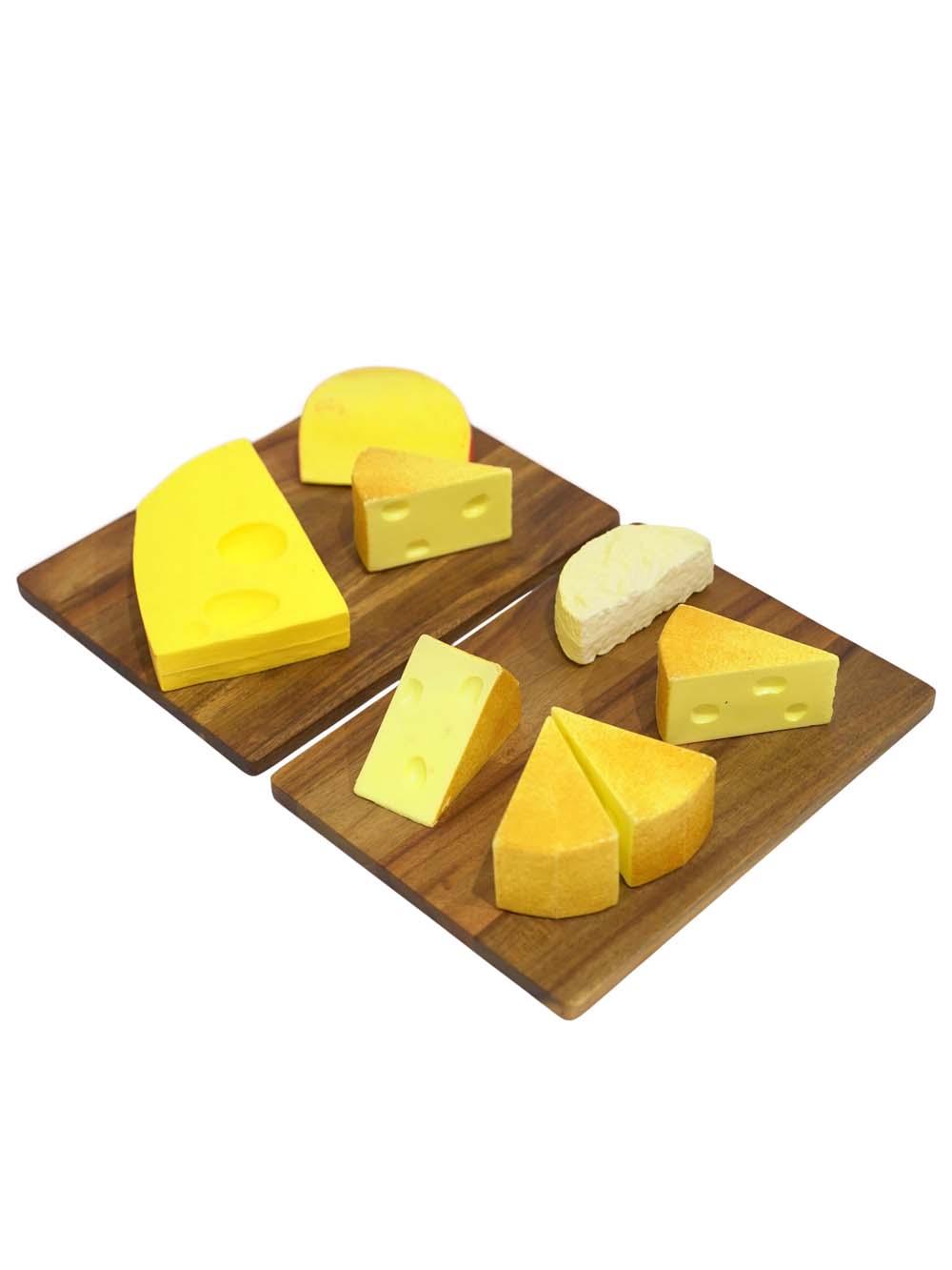 Cheese Board – Small – (Style May Vary) for hire Up the cheese at your next event with our cheeseboards, featuring a variety of fake blocks of cheese attached to a wooden display board. Please note, this listing is for 1 cheese board and may vary from those pictured.