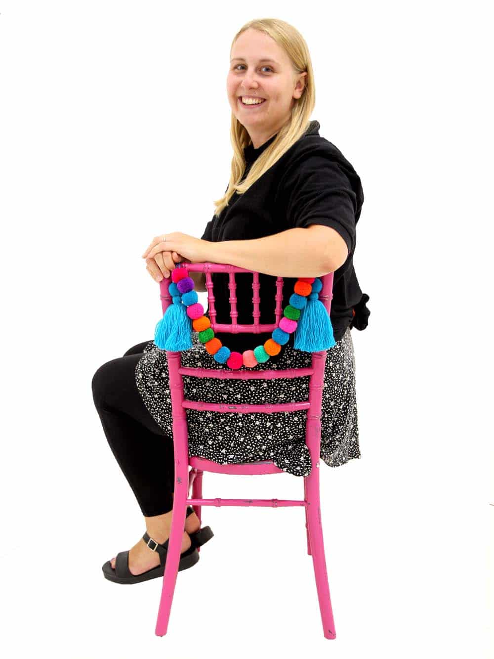 Chiavari Chair – Distressed Bright Pink, Linen Seat Pad + Blue Pom Pom Swag