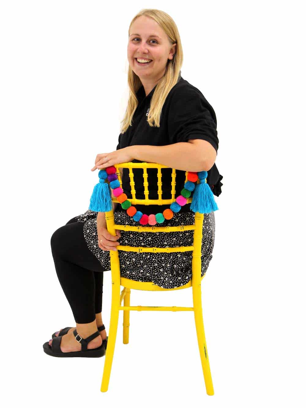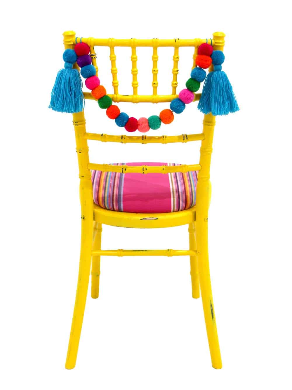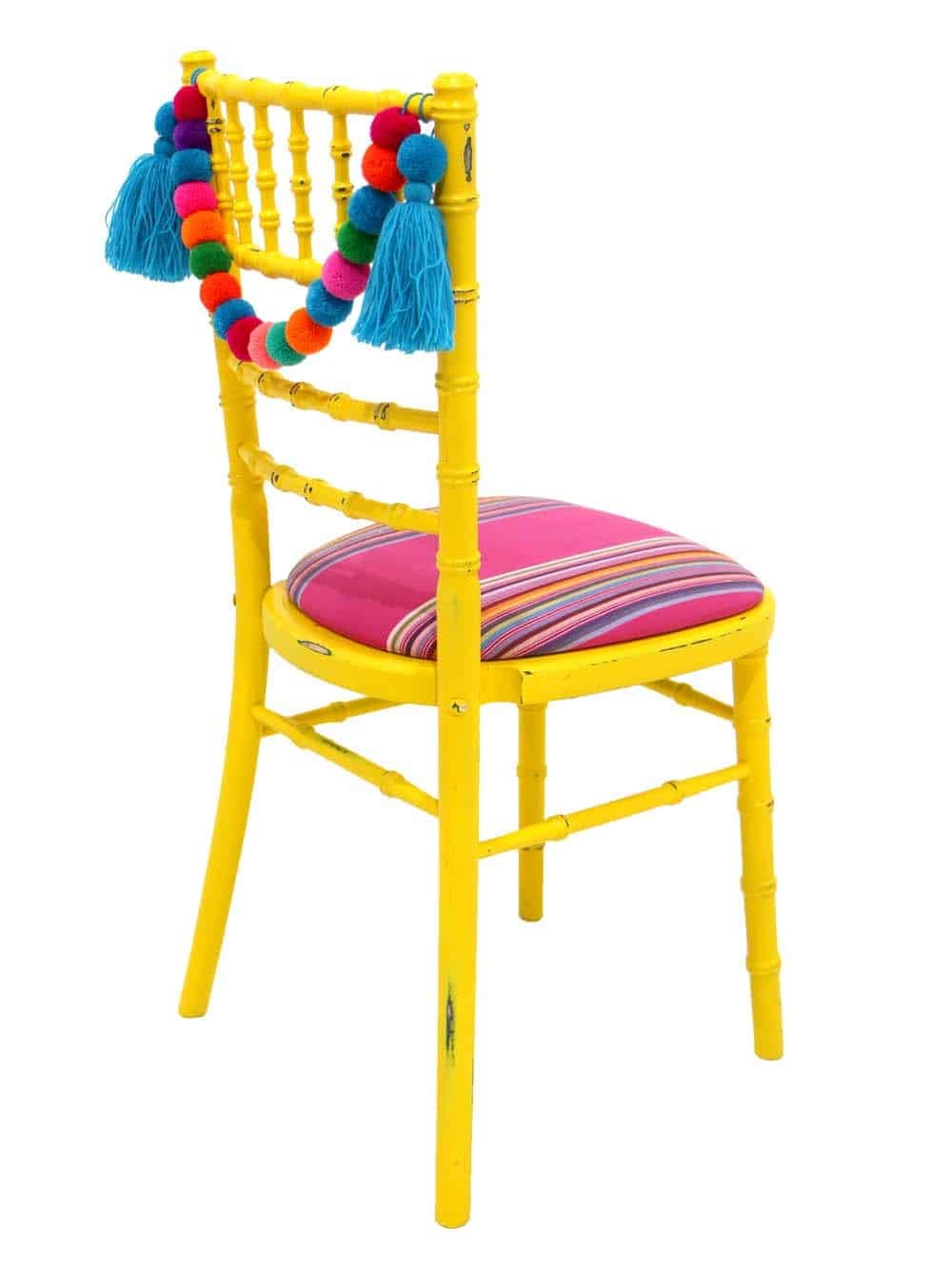 Chiavari Chair – Distressed Bright Yellow, Pink Seat Pad + Blue Pom Pom Swag