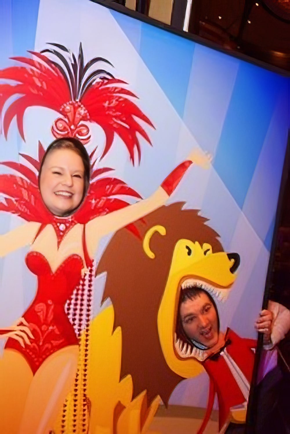 Circus Peep Thru Board to hire. This circus peep thru board depicts a circus ringmaster with his head inside a lion’s mouth as a glamourous assistant looks on. With faceholes for the ringmaster and glamourous assitant, this prop to hire will provide a fantastic photo opportunity at your circus themed event party. Prop is freestanding.