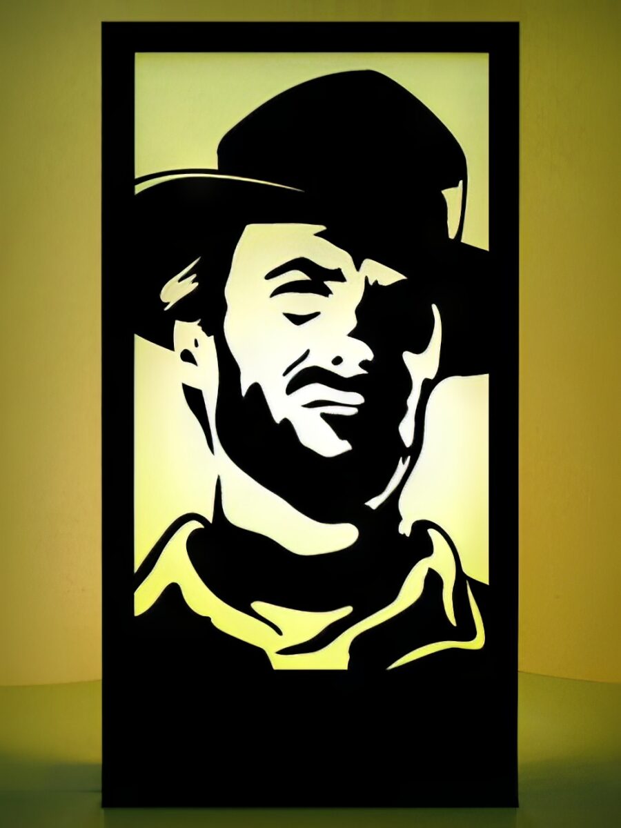 Clint Eastwood Silhouette Panel for hire. This lit silhouette panel depicting the legend that is Clint Eastwood comes supplied with lighting. Please note that the actual lighting colour supplied may vary from that depicted. ย All Parcan lights have a 1m lead and it is the responsibility of the client to provide extension leads if longer leads are required. ย The price quoted includes one supplied light.