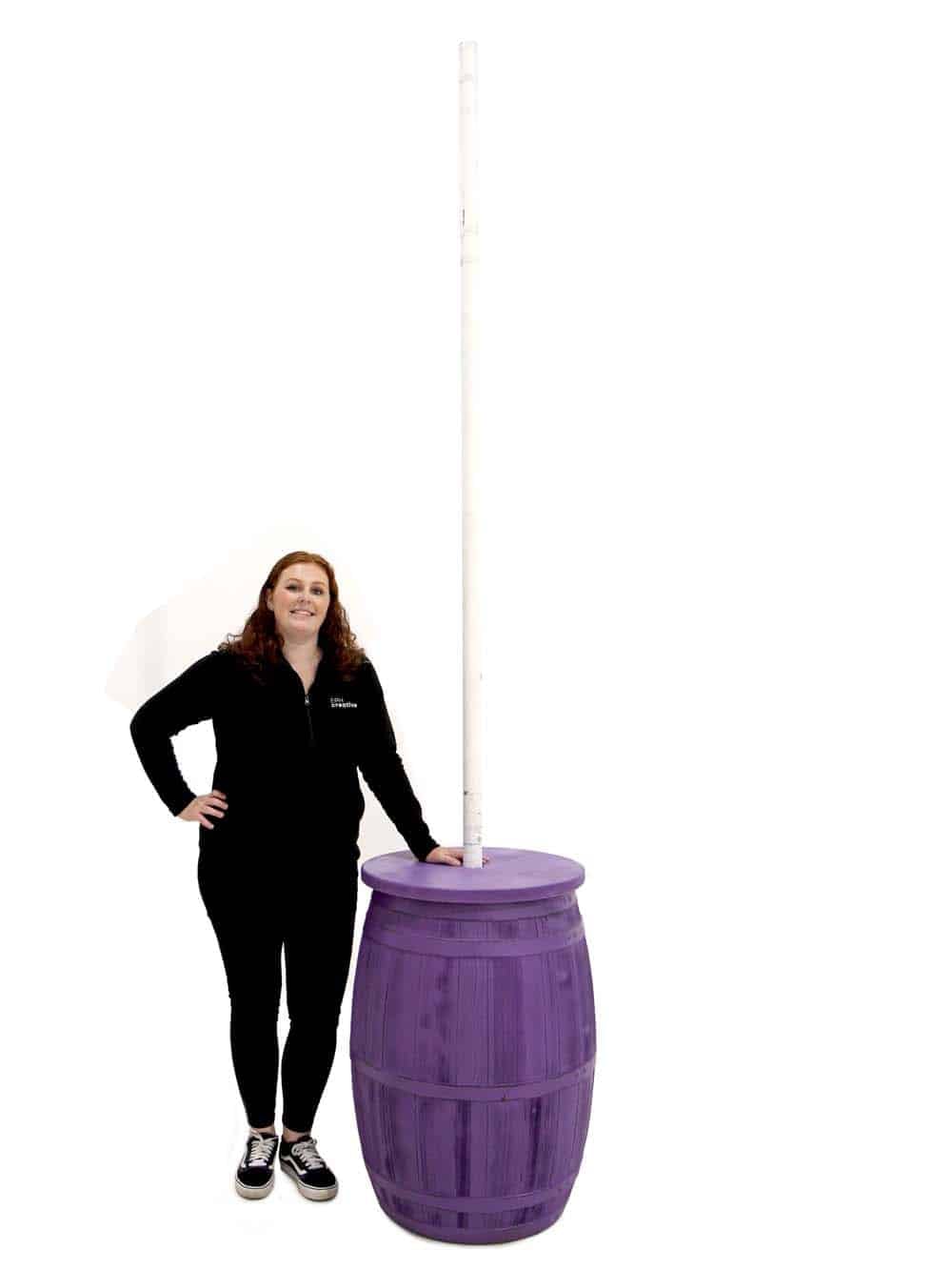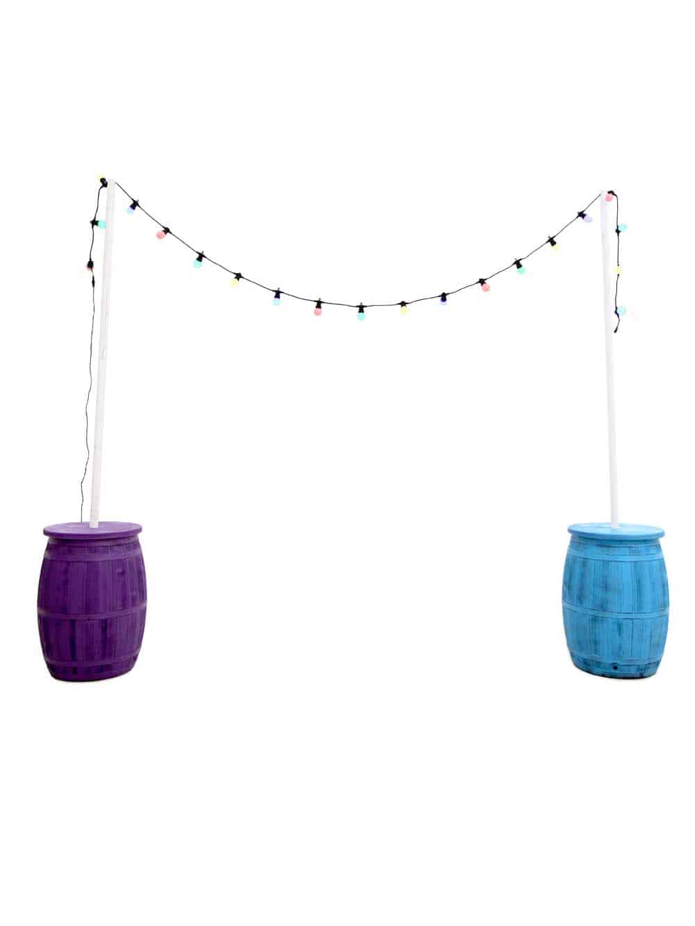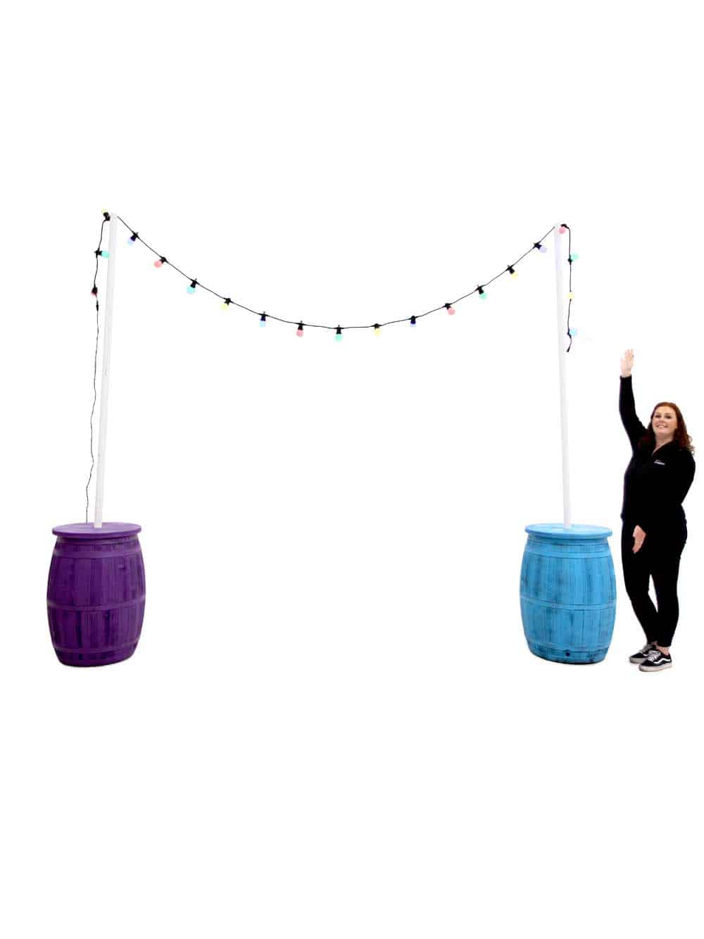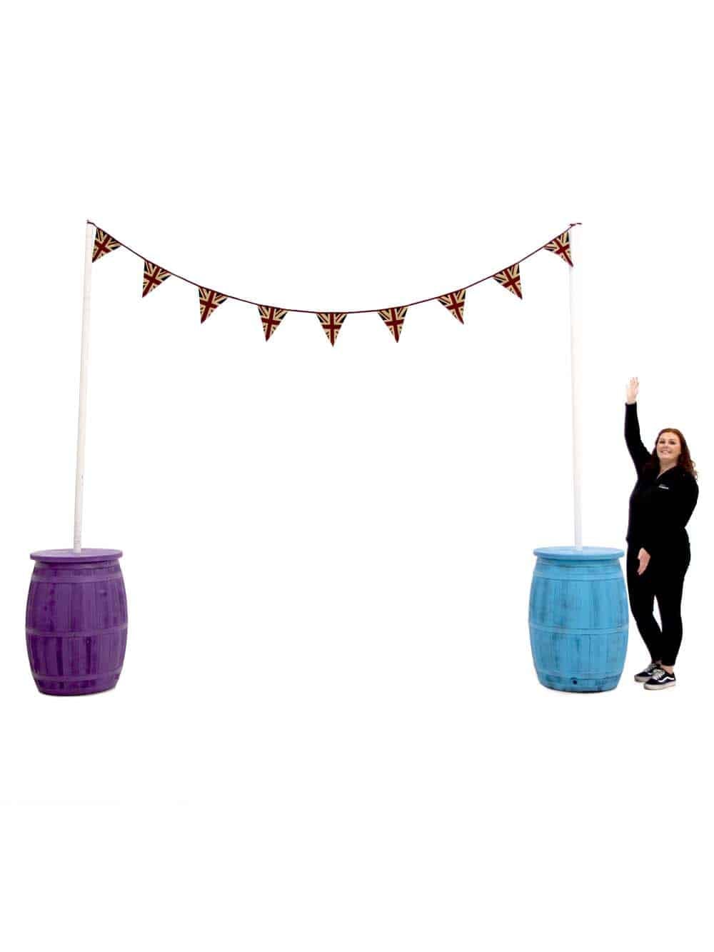 Coloured Rustic Barrel Festoon/Bunting Unit to hire. These rustic looking festival style barrels are designed with metal poles running through the centre, allowing you to easily string either bunting or festoon lighting between them to create a simple but effective supporting structure that will suit events with themes ranging from Fairground to Caribbean.