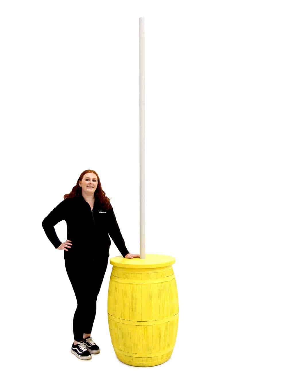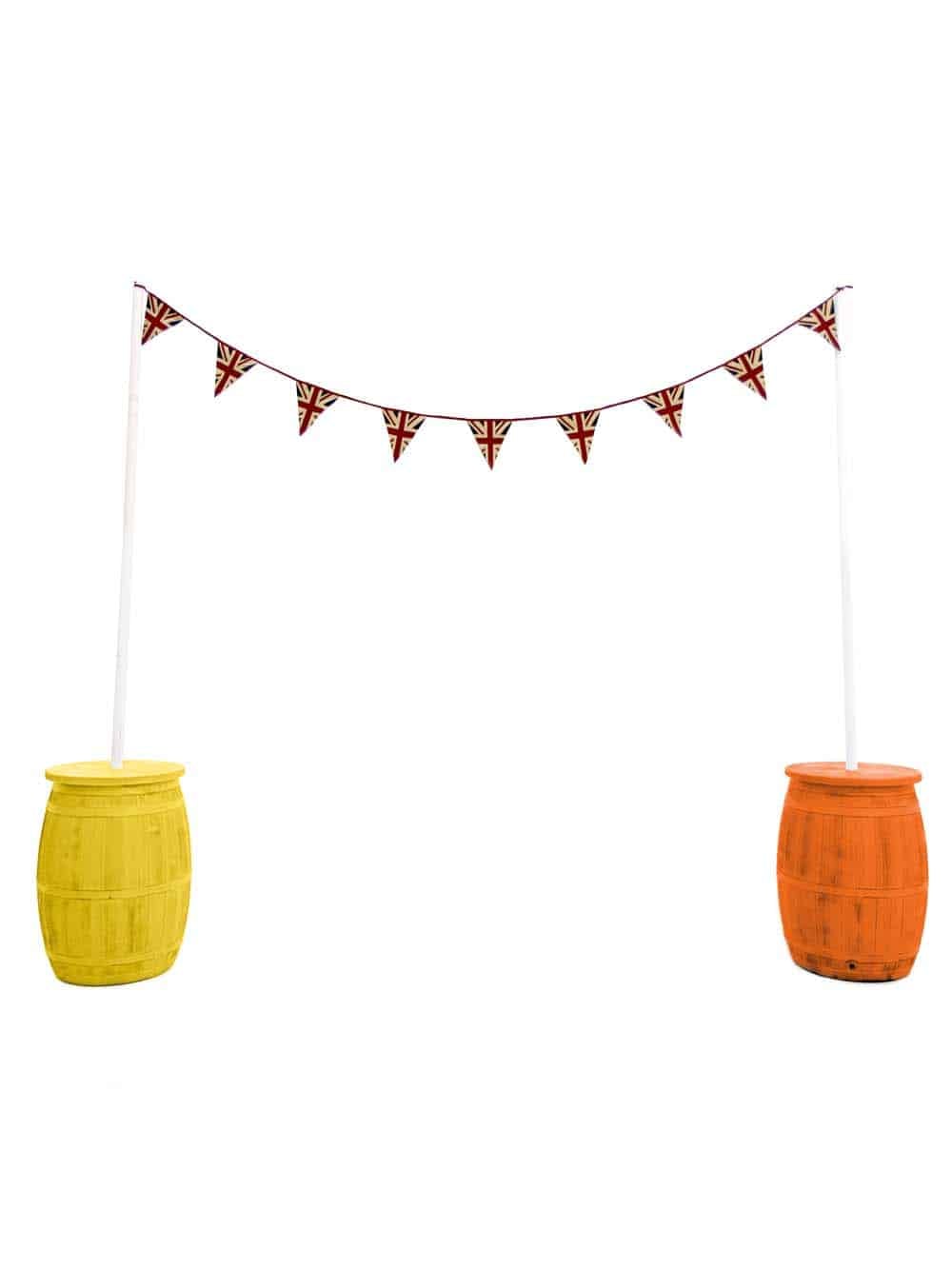 Coloured Rustic Barrel Festoon/Bunting Unit to hire. These rustic looking festival style barrels are designed with metal poles running through the centre, allowing you to easily string either bunting or festoon lighting between them to create a simple but effective supporting structure that will suit events with themes ranging from Fairground to Caribbean.