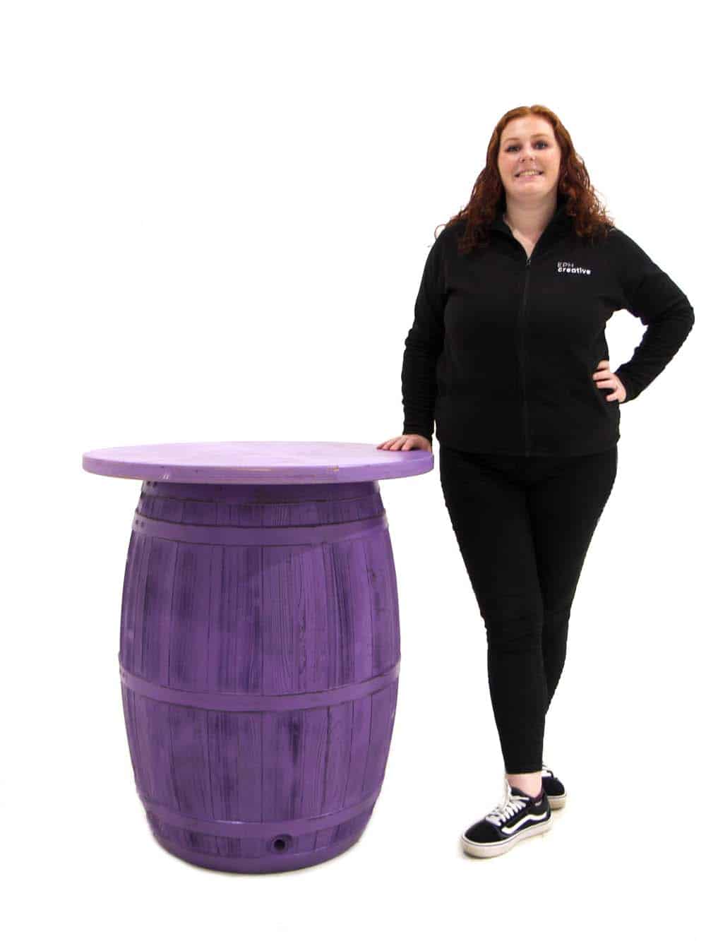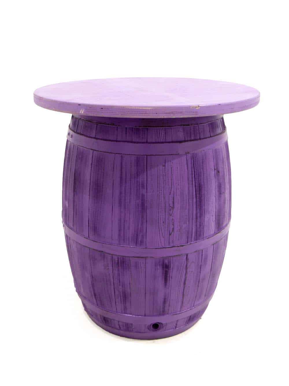 Rustic Coloured Barrel Poseur Table to hire. This wood effect barrel poseur table is painted in a fabulous bright colour and is perfect for many themes, from a Caribbean themed event or party to a circus or festival themed event. We ย’ve lots of fantastic stools that would look great with these too; take a look!