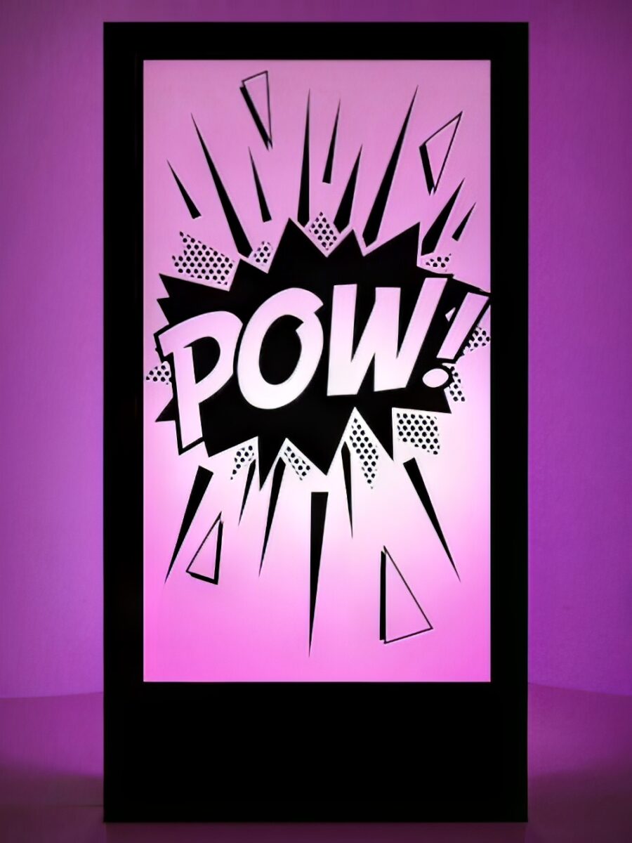 Comic Strip Silhouette Panel for hire. This is fabulous theming for any Superhero themed event. All of our silhouette panels come supplied with an LED colour changing light. The price quoted includes one supplied light which has a 1m lead – it is the responsibility of the client to provide extension leads if longer leads are required.