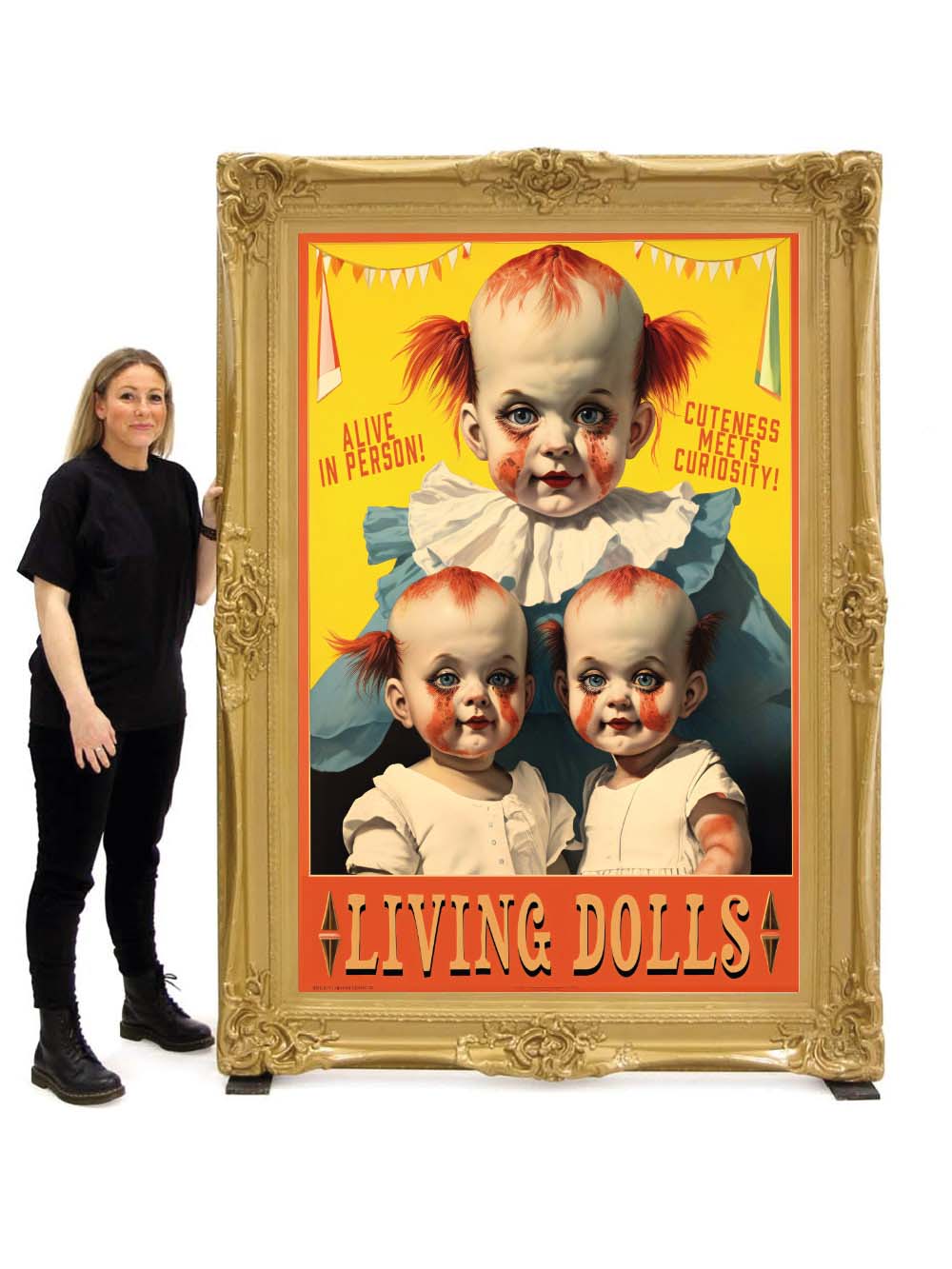 Creepy Living Dolls Halloween Circus Print in Gold Frame. Great theming for Halloween Circus Freakshow Themed events. Check out the full range of Halloween theme prints in giant frames.