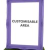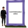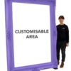 Customised Giant Purple Frame for hire. We supply with the frame a laminated print on vinyl applied to 5mm thick white foamed board. The printed insert fits into the decorative frame from the back and is held in place with clips. The ornate frame sits upright on a supporting black base. This size of frame is also available in many other colours! We also have smaller customisable ornate frames. We can create the customised artwork for your event. We have a highly skilled team of graphic designers who can help you with the customisation of our large ornate frames. We can design customised graphics to suit your event theme. ย Contact us for more details. Alternatively you can customise this product yourself then we can take care of the printing for you, we just need your artwork. We offer downloadable artwork templates to help you create print ready artwork, accessible via the download links below.