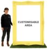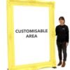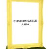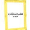 Customised Giant Yellow Frame for hire. We supply with the frame a laminated print on vinyl applied to 5mm thick white foamed board. The printed insert fits into the decorative frame from the back and is held in place with clips. The ornate frame sits upright on a supporting black base. This size of frame is also available in many other colours! We also have smaller customisable ornate frames. We can create the customised artwork for your event. We have a highly skilled team of graphic designers who can help you with the customisation of our large ornate frames. We can design customised graphics to suit your event theme. ย Contact us for more details. Alternatively you can customise this product yourself then we can take care of the printing for you, we just need your artwork. We offer downloadable artwork templates to help you create print ready artwork, accessible via the download links below.