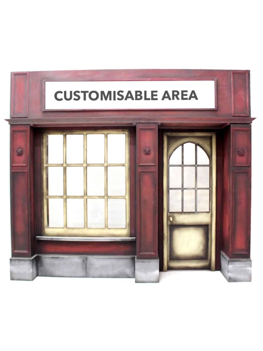 Customised Maroon Traditional Building Front with a Custom insert in the Top Sign. We supply you with a custom printed insert made from 2mm thick foamed board. This slots into the top sign in the Customised Maroon Traditional Building front. We also offer this customised building front with a brown colour finish. Use this shop front as an entranceway or simply as decor; which ever you choose this shop front would look great at your event to help create the look of a Victorian or traditional street. We can create the customised artwork for your event. We have a highly skilled team of graphic designers who can help you with the customisation of our Customised Shop Front Prop. We can design customised graphics to suit your event theme. Contact us for more details. Alternatively you can customise this product yourself then we can take care of the printing for you, we just need your artwork. We offer downloadable artwork templates to help you create print ready artwork, accessible via the download links below.