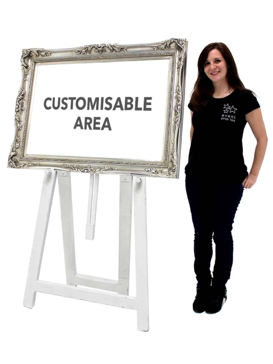 Customised Ornate Silver Frame Welcome / VIP Sign for hire. We supply a laminated print on vinyl applied to 3mm thick black foamed board. This slots into the back of the VIP / Welcome Sign. The frame sits on a white easel. This Silver Framed custom sign is also available on a black easel. We also offer this customisable frame in Black, Gold, ย Purple and Pink. We can create the customised artwork for your event. We have a highly skilled team of graphic designers who can help you with the customisation of our Silver ornate frame VIP / Welcome Sign. We can design customised graphics to suit your event theme. Contact us for more details. Alternatively you can customise this product yourself then we can take care of the printing for you, we just need your artwork. We offer downloadable artwork templates to help you create print ready artwork, accessible via the download links below. We offer downloadable artwork templates to help you create print ready artwork, accessible via the download links below.