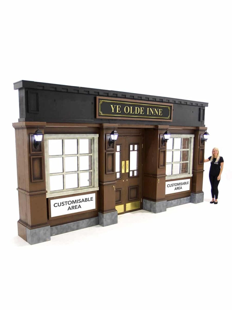 Customised Pub Front with Custom Inserts for the Signs underneath the Pub windows. We supply a set of laminated prints on vinyl applied to 2mm thick white foamex board. These slot into the wooden frames of the under window signs. The pub is supplied with a stock insert in the top sign that reads ย “Ye Olde Inne”. You can also customise the top sign with this product. We can create the customised artwork for your event. We have a highly skilled team of graphic designers who can help you with the customisation of our Customised British Pub Front. We can design customised graphics to suit your event theme. Contact us for more details. Alternatively you can customise this product yourself then we can take care of the printing for you, we just need your artwork. We offer downloadable artwork templates to help you create print ready artwork, accessible via the download links below. Alternatively you can customise this product yourself then we can take care of the printing for you, we just need your artwork. We offer downloadable artwork templates to help you create print ready artwork, accessible via the download links below.