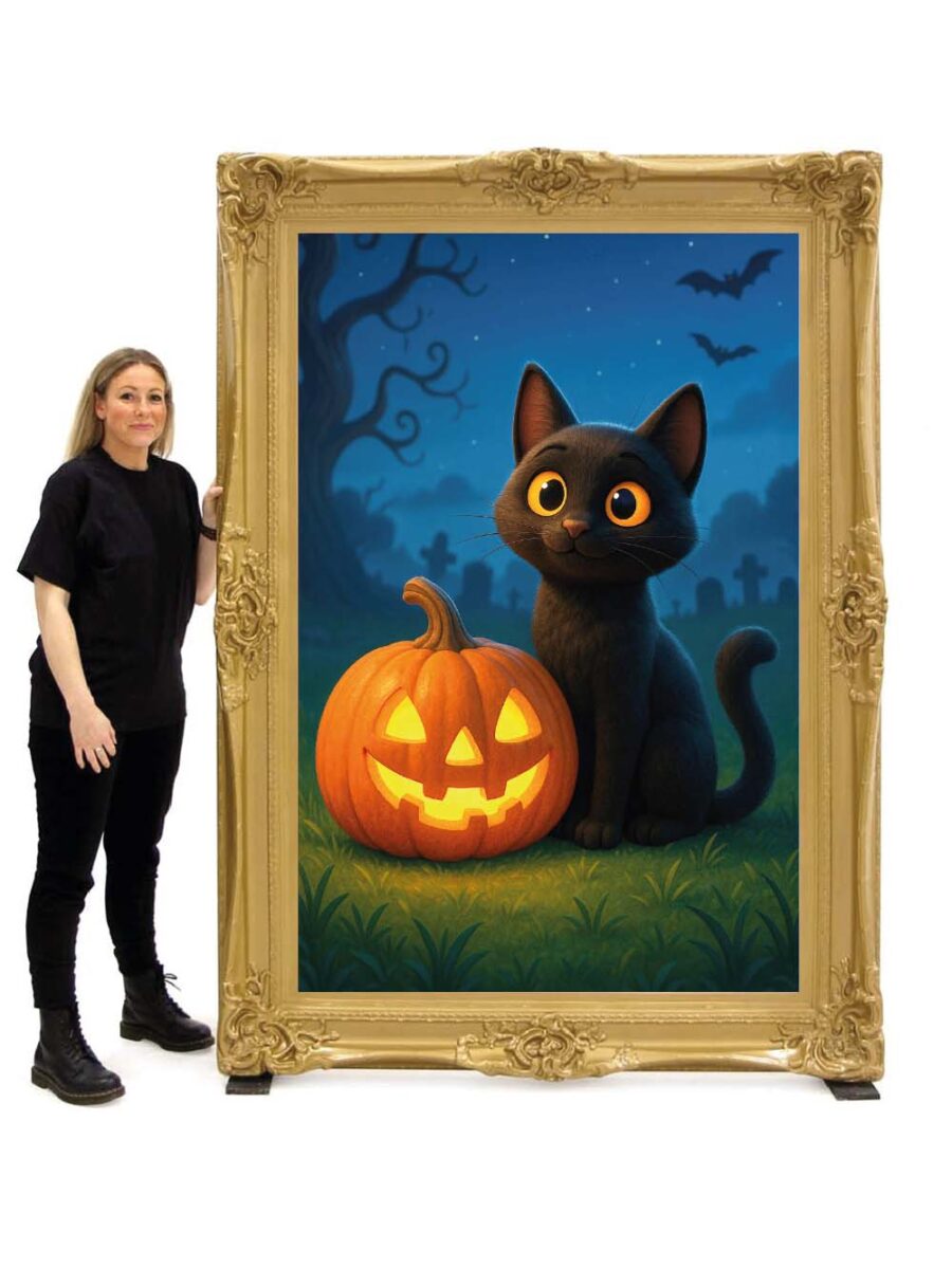 Cute Black Cat next to Pumpkin in Giant Gold Frame. Great theming for family friendly halloween event. Check out the full range of Halloween theme prints in giant frames.