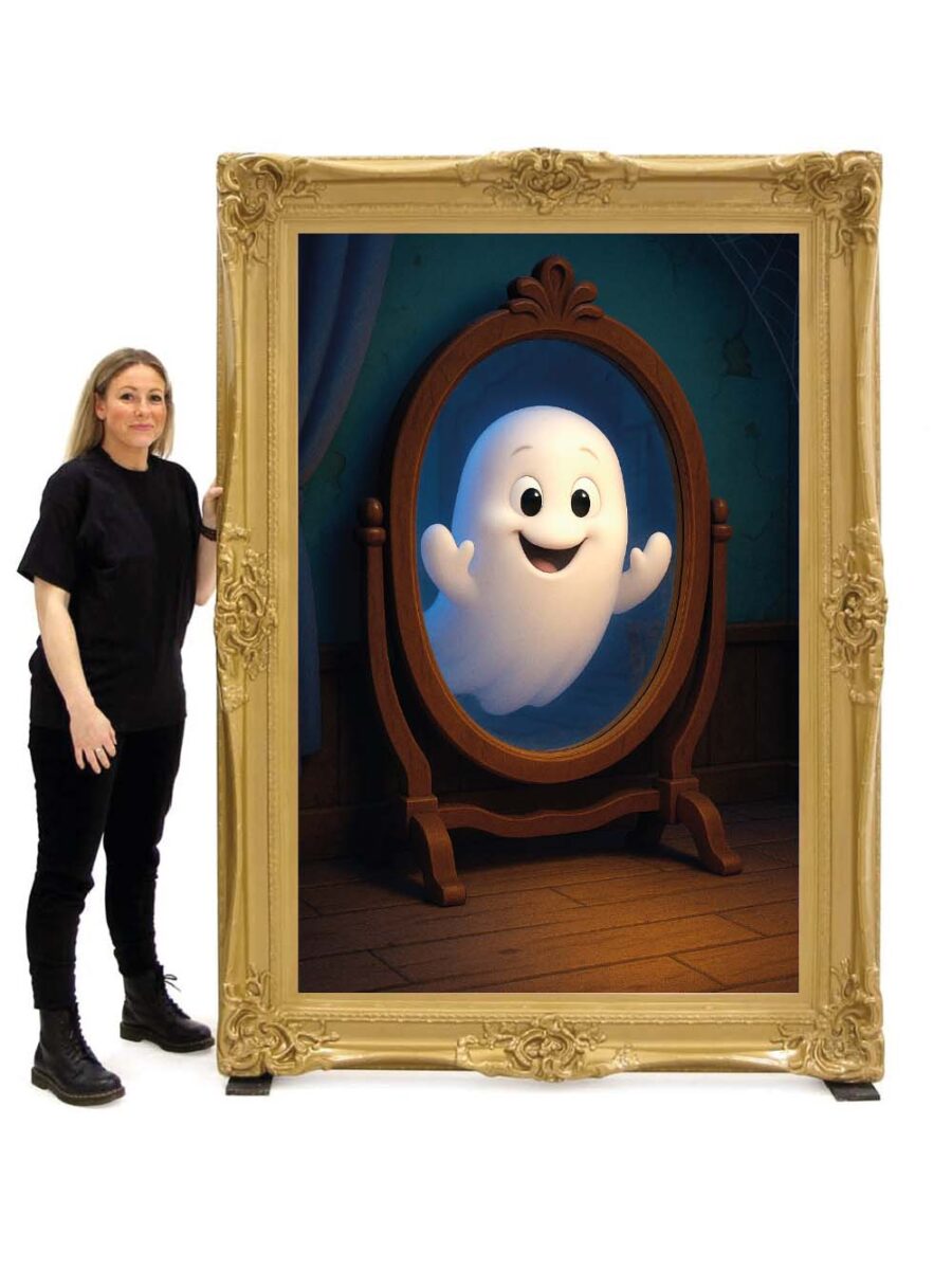 Cute Halloween Cat in a Mummy Costume in Giant Gold Frame. Great theming for family friendly halloween event. Check out the full range of Halloween theme prints in giant frames.